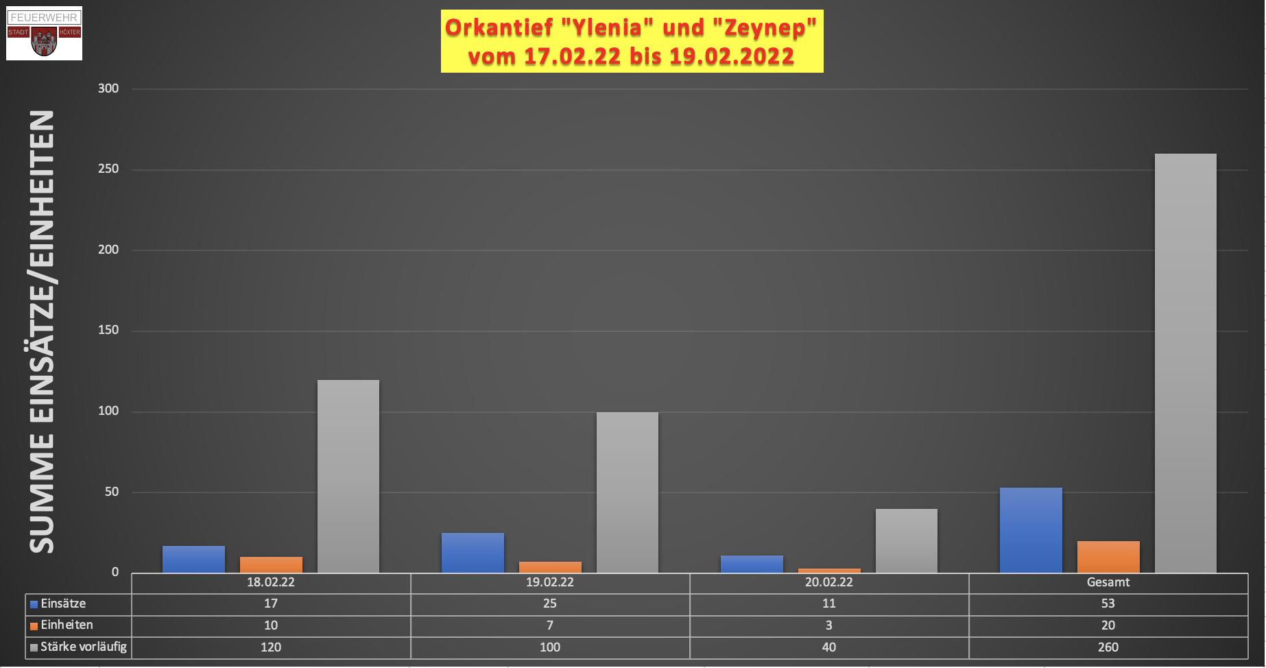 Mit insgesamt 53 Einsatzstellen mussten 20-mal Einheiten beauftragt werden. Hier waren dann insgesamt ca. 260 Einsatzkräfte der gesamten Feuerwehr Höxter im Einsatz.