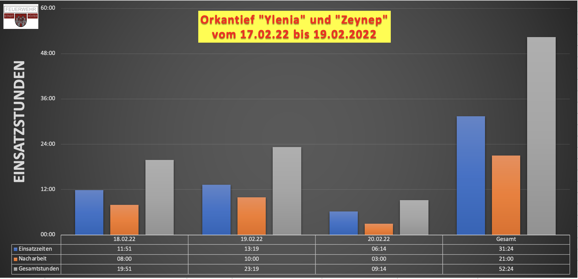 Höxter 20.02.2022 (SCJU) Nachdem sich das Wetter wieder beruhigt hat und die Einheiten der Feuerwehr Höxter sich ausruhen dürfen, kann eine Bilanz der beiden Orkane "Ylenia" und "Zeynep" gezogen werden. Die Bilanz zeigt wieder einmal wie die Belastung der rein ehrenamtlichen Einsatzkräfte der Feuerwehr Höxter im Zeitraum vom 17.02.2022 bis zum Morgen des 19.02.2022 sehr hoch war. Glücklicherweise ist keine Einsatzkraft dabei verletzt worden und auch der Schaden am technischen Gerät der Feuerwehr ist mit 2 Ausnahmen zu verschmerzen. Die nächsten Tage müssen aber bestimmt noch viele Stunden für Nacharbeiten benötigt werden.