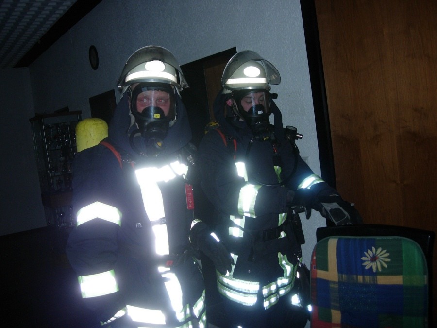 Welches Rettungs- oder Tragemittel wo angebracht ist, genau darauf zielte diese Übung ab. Weil die Nebelmaschine nicht funktionierte, behalf man sich provisorisch mit einem Folien-Aufsatz für die Atemschutzmasken, damit die Trupps garantiert nichts sehen können, ganz wie im wirklichen Einsatz. Löschgruppenführer Uwe Hirsch war mit dem Resultat der Übung zufrieden. "Übung macht halt nur den Meister", berichtet Uwe Hirsch. Überwacht wurde die Übung vom stellv. Löschgruppenführer Daniel Böhner.