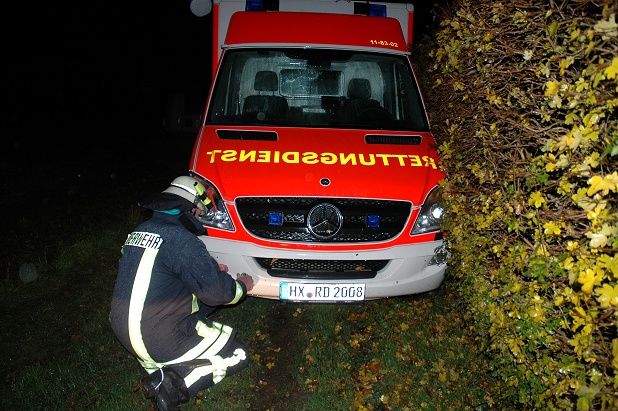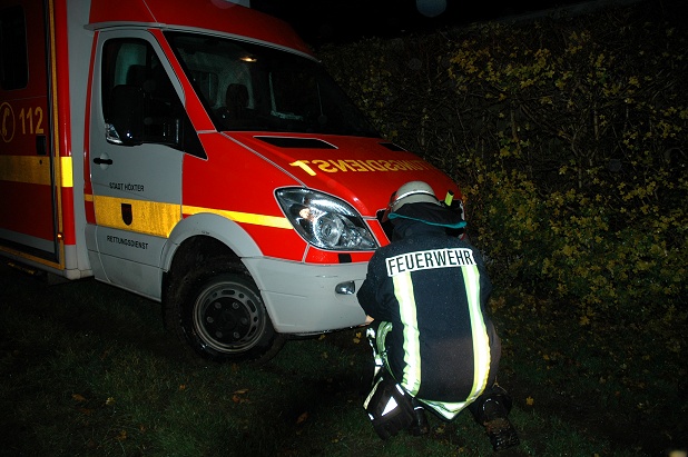 • Festgefahrener Rettungswagen auf rutschigem Grund bei einem Notfalleinsatz