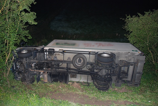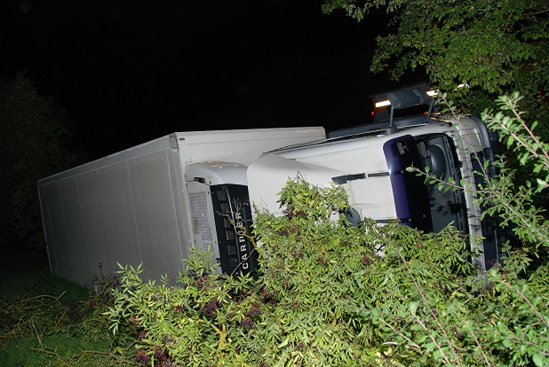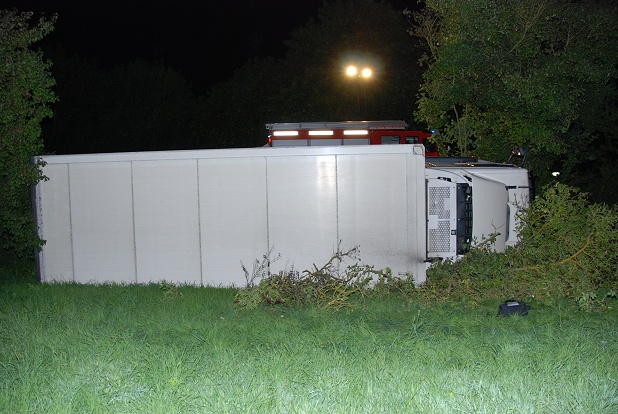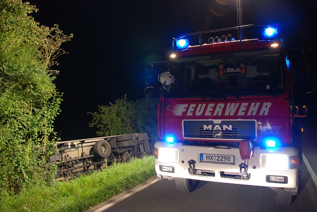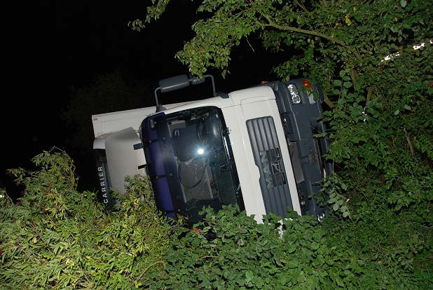 LKW liegt auf der Seite im Graben