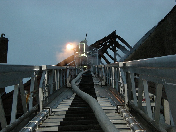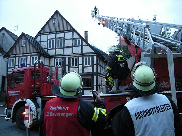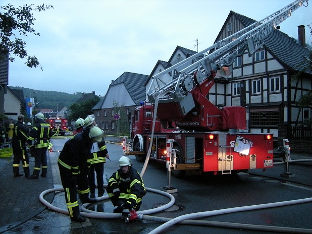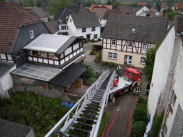 Einsatz eines C-Rohres über die Drehleiter Höxter durch die Fenster und das Dach des Hauses zur Brandbekämpfung