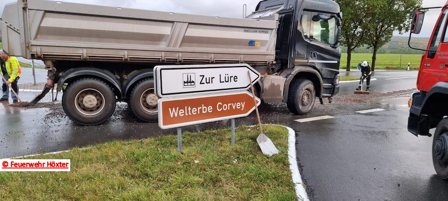 • LKW hat im Kreuzungsbereich einen Teil seiner Ladung Kies auf einer Fläche von ca. 600 qm verloren