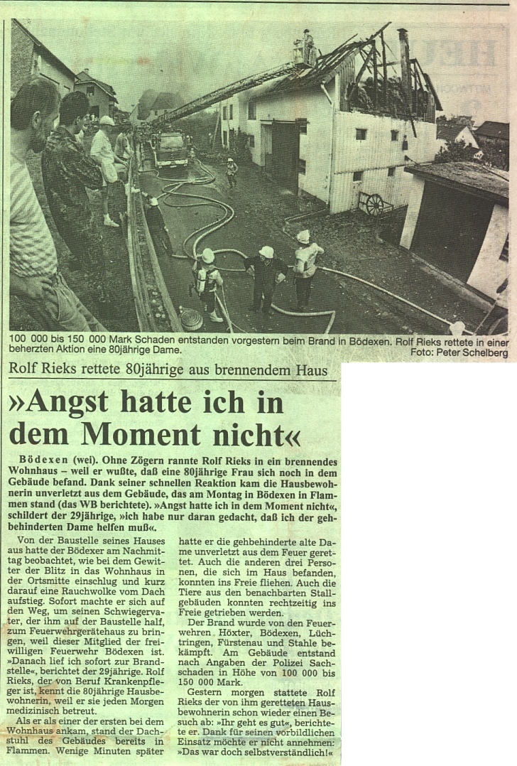 Am 1. August 1994 brannte in der Ortschaft Bödexen der gesamte Dachstuhl eines Wohnhauses nieder. Brandursache war ein Blitzeinschlag nach einem heftigen Gewitter. Bei dem Grossbrand entstand ein Sachschaden von etwa 150.000 Mark. Durch den beherzten Einsatz eines Passanten konnte eine 80-jährige Dame noch aus dem brennenden Haus gerettet werden. Neben der Löschgruppe Bödexen und dem Löschzug Höxter waren noch die Löschgruppen Fürstenau, Lüchtringen und Stahle mehrere Stunden lang im Einsatz.