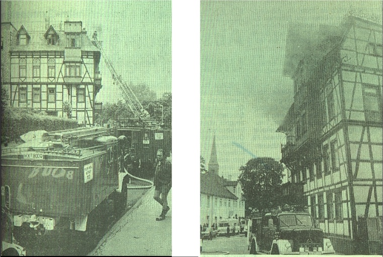 Der Löschzug Höxter rückte am 06. Juni 1979 um 10.25 Uhr zu einem Wohnungsbrand in der Engemundstrasse Ecke Bachstrasse aus. Als die Einsatzkräfte am Einsatzort eintrafen, brannte das im Dachgeschoss gelegene Wohn- und Schlafzimmer bereits in voller Ausdehnung. Kurze Zeit später griff das Feuer auch auf den Dachstuhl des Hauses über. Zwei Trupps unter schwerem Atemschutz drangen bis zum Dachgeschoss vor und leiteten die Brandbekämpfung mit zwei C-Rohren ein.