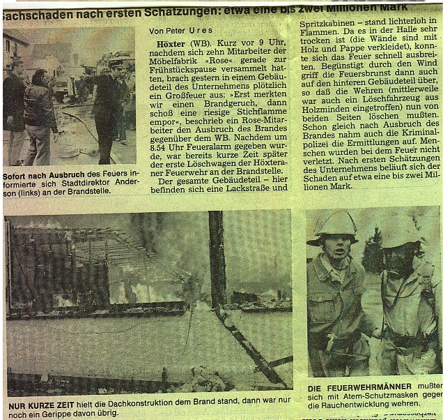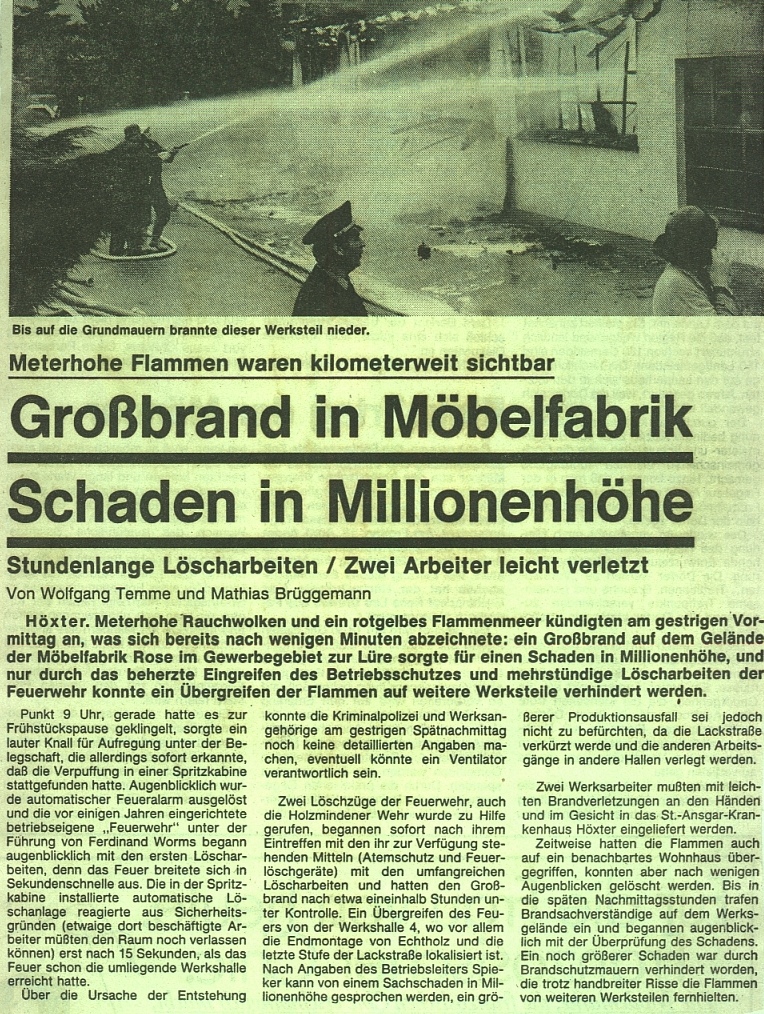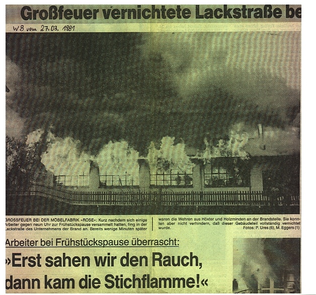 Eine große Fertigungshalle der Möbelfabrik "Rose" im Industriegebiet "Lüre" fiel am 26. März des Jahres 1981 einem Großbrand zum Opfer. Kurz vor 9.00 Uhr, nachdem sich zehn Mitarbeiter der Möbelfabrik "Rose" gerade zur Frühstückspause versammelt hatten, brach in einem Gebäudeteil des Unternehmens plötzlich Feuer aus. "Erst bemerkten wir einen Brandgeruch, dann schoss eine riesige Stichflamme empor," beschrieb ein Mitarbeiter den Ausbruch des Feuers.