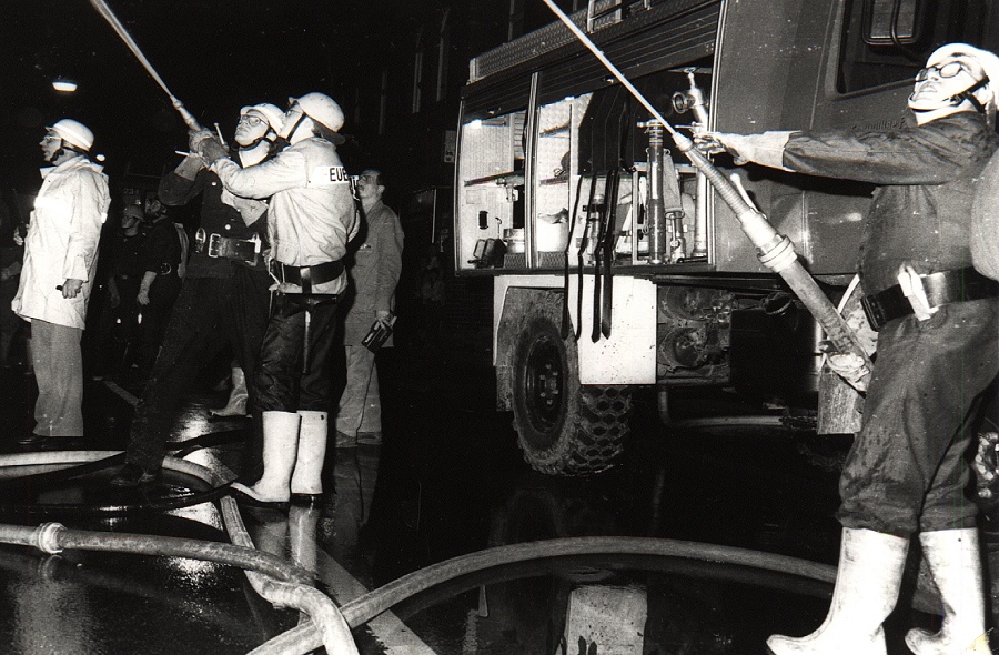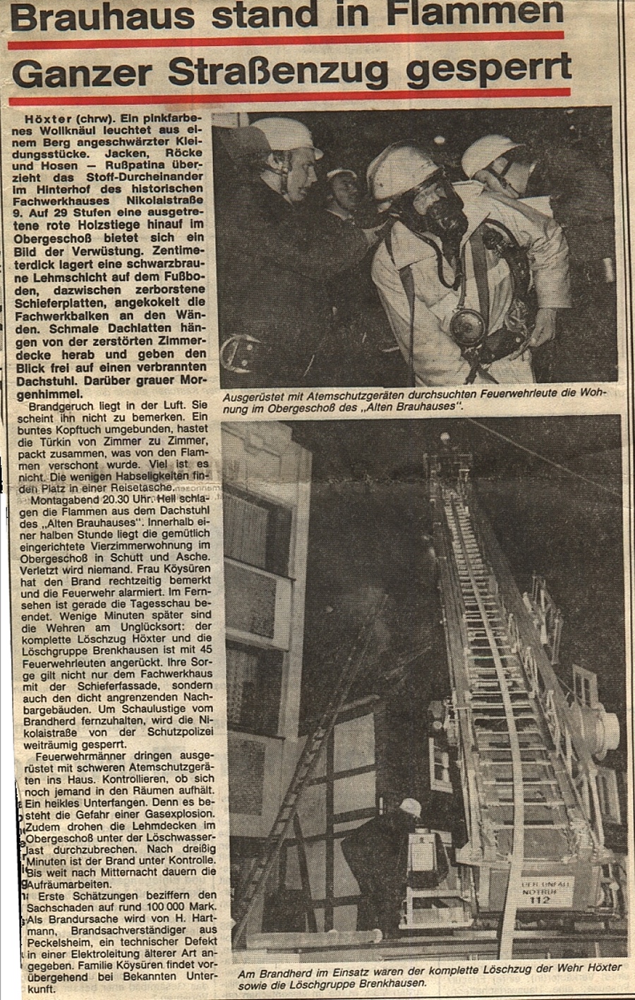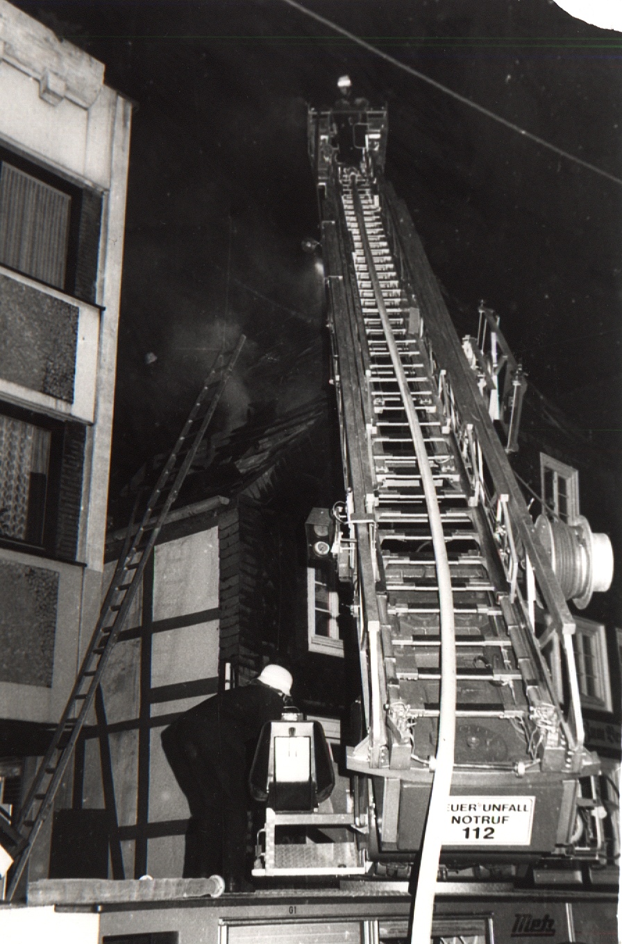 Am 04. Oktober 1987 brannte der Dachstuhl einer Gaststätte (altes Brauhaus) in der Nicolaistrasse in Höxter völlig nieder. Um 20.20 Uhr wurde das Feuer der Kreisleitstelle gemeldet, die daraufhin den Löschzug Höxter alarmierte. Gegen 20.30 Uhr trafen die ersten Einsatzfahrzeuge des Löschzuges an der Einsatzstelle ein, da brannte der Dachstuhl bereits in voller Ausdehnung. Insgesamt nahmen die Einsatzkräfte 6 C-Rohre sowie 1 B-Rohr vor.