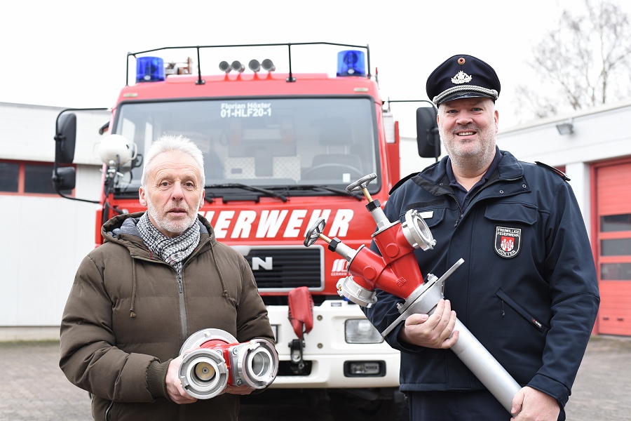 Höxter / 04.12.2017 (TKu). Armaturen mit neuer Sicherungseinrichtung für die Feuerwehr: Für die fünf Löschzüge der Freiwilligen Feuerwehr Höxter wurden neue „Standrohre“ zur Wasserentnahme und sogenannte „Sammelstücke“ zur Wasserfortleitung beschafft. Die Kosten dafür betrugen etwa 11.500 Euro. Die neuen Armaturen verfügen über Sicherungseinrichtungen, die eine Beeinträchtigungen des Trinkwassers und des Rohrnetzes bei Löschwasserentnahmen vermeiden. Bei Löschwasserentnahmen am Hydranten mittels Standrohr können unter ungünstigen Umständen wegen Fehlen geeigneter Sicherungseinrichtungen infolge von Rückfluss Verunreinigungen in das Rohrnetz gelangen. Die Trinkwasserqualität kann somit gestört und das Fließverhältnis im Rohrnetz beeinflusst werden, wodurch auch Rohrbrüche durch dynamische Druckänderungen (Druckstöße) möglich sind.
