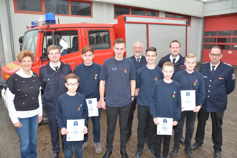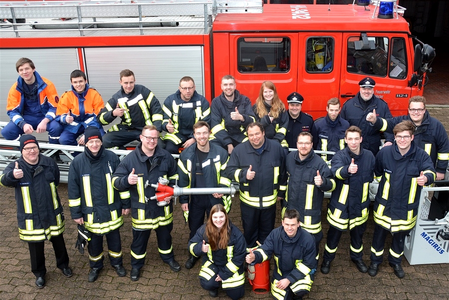 Höxter / 16.12.2017 (TKu). 13 Feuerwehr-Anwärter und zwei Anwärterinnen aus dem Stadtgebiet Höxter haben kürzlich die Feuerwehr-Grundausbildung (Truppmann Modul A) bestanden. Stadtbrandinspektor Jürgen Schmits ist froh, zahlreiche neue Nachwuchswehrleute in den Reihen der Feuerwehr Höxter begrüßen zu können und gratulierte den 15 Absolventen. Nachwuchsgewinnung wird für die Freiwillige Feuerwehr immer schwieriger. Umso erfreulicher ist es daher, die frisch ausgebildeten Kameraden neu für die Wehr gewonnen zu haben, erklärte Schmits. Auch die erste Feuerwehrfrau aus Brenkhausen, Janina Klocke, absolvierte den Lehrgang mit Erfolg. Mittlerweile ist sie aber nicht mehr die einzige Feuerwehrfrau in Brenkhausen. Kurz vor dem Lehrgang hat sie Freunde zum Eintritt in die Freiwillige Feuerwehr bewegen können. Anna-Lena Schulz und Kevin Redecker aus ihrem Freundeskreis bereichern ab sofort die Löschgruppe Brenkhausen.