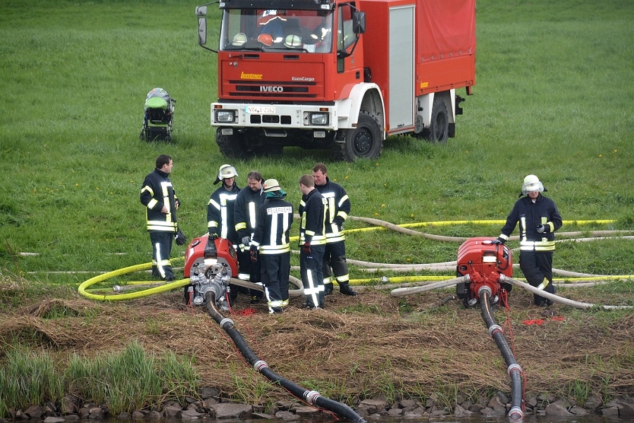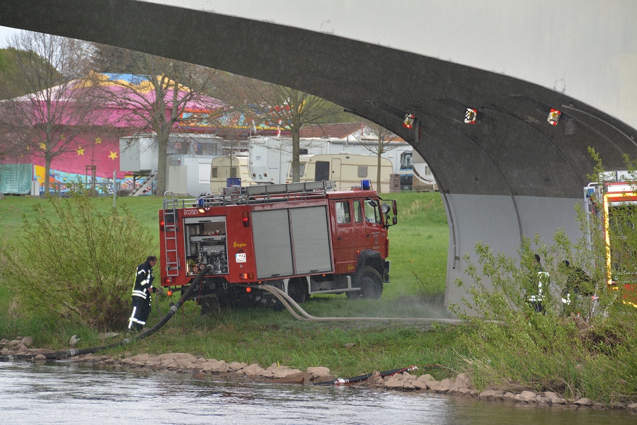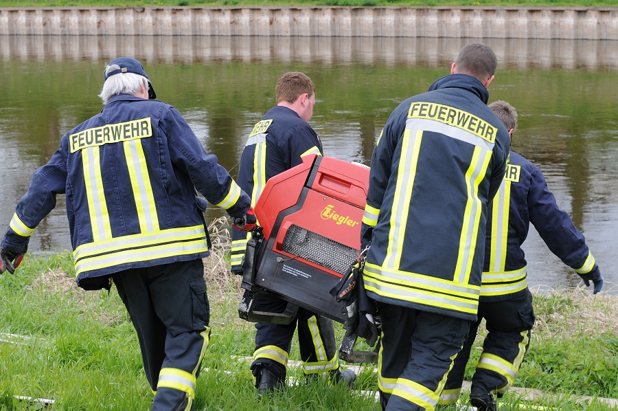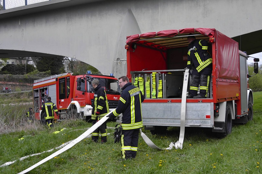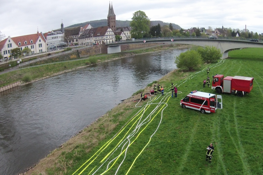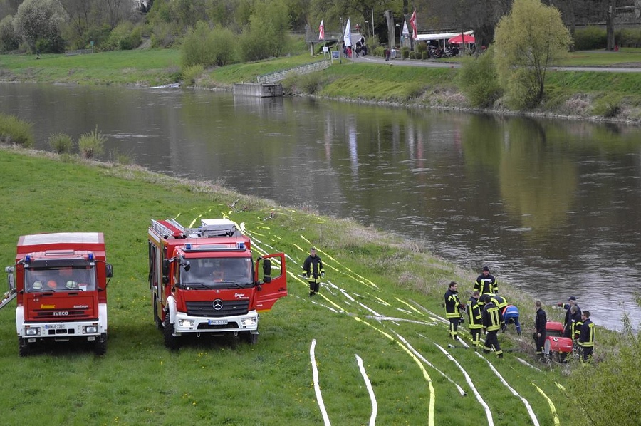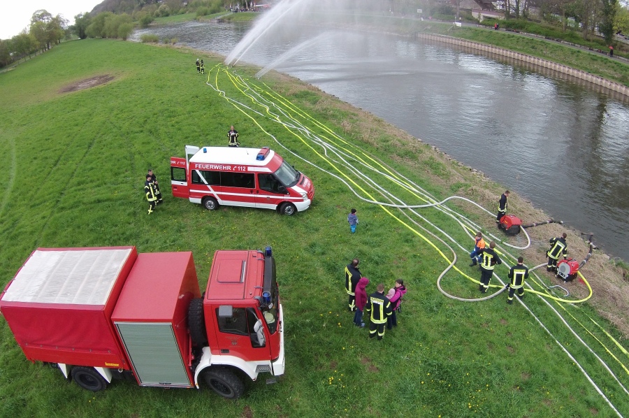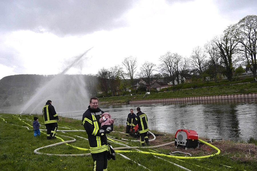 Höxter / 23.04.2017 (TKu). Nach langjähriger Tradition hat die Feuerwehr Höxter wieder die Wasserspiele zum Saisonstart der Weserschifffahrt „Flotte Weser“ in Höxter ausgerichtet. „Die Wasserspiele mit vier Strahlrohren und zwei großen Wasserorgeln sollten in diesem Jahr ein H mit einem X darin symbolisieren als Kennzeichnungsbuchstaben für Höxter“, erklärte Zugführer Holger Dittrich. Erstmalig war auch das nagelneue Löschgruppenfahrzeug (LF20-KatS) bei dieser Aktion mit eingebunden. Die beiden Fahrgastschiffe „Höxter“ und „Holzminden“ kamen mit 40-minüter Verspätung am Anleger in Höxter an.
