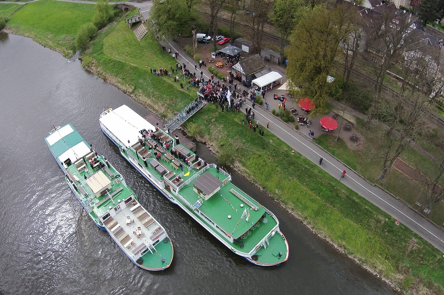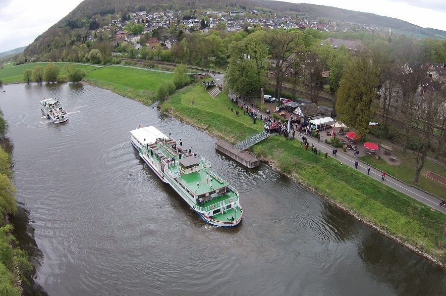 Der große Saisonstart erfolgte in diesem Jahr nach achtjähriger Pause wieder mal an nur einem Tag von der Barockstadt Bad Karlshafen bis in die Rattenfängerstadt Hameln. Die Schiffe passierten auf ihrer 91,32 Kilometer langen Schiffsreise von Bad Karlshafen bis nach Hameln insgesamt 13 weitere Stationen und drei Bundesländer. Begleitet wurden die zahlreichen Fahrgäste an Bord wieder von einigen Märchenfiguren in farbenprächtigen Kostümen. Beim Einlaufen der Fahrgastschiffe in Höxter sorgte zudem noch die Blaskapelle Ovenhausen für die musikalische Unterhaltung der wartenden Gäste. Als die Weserschiffe an den Feuerwehrfahrzeugen vorbeifuhren, wurde sich auf beiden Seiten zugewunken. Mit Blaulicht und Martinshorn verabschiedete die Feuerwehr Höxter die Schiffe dann in Richtung Holzminden.