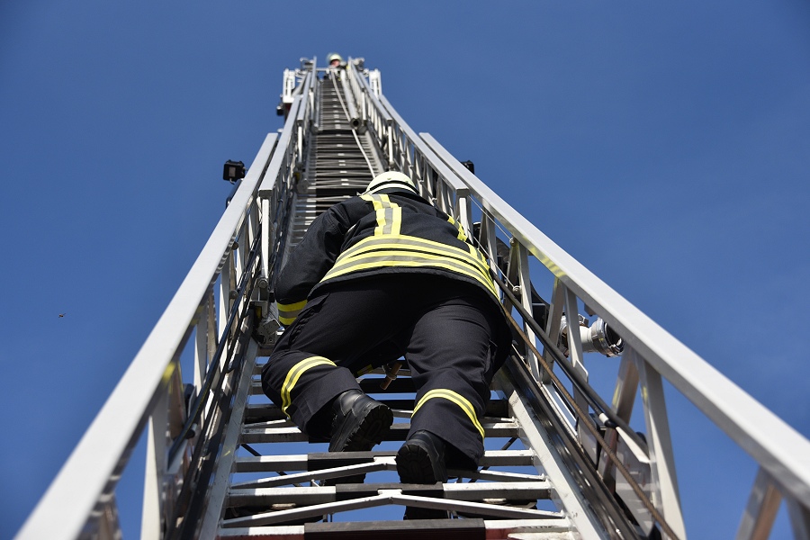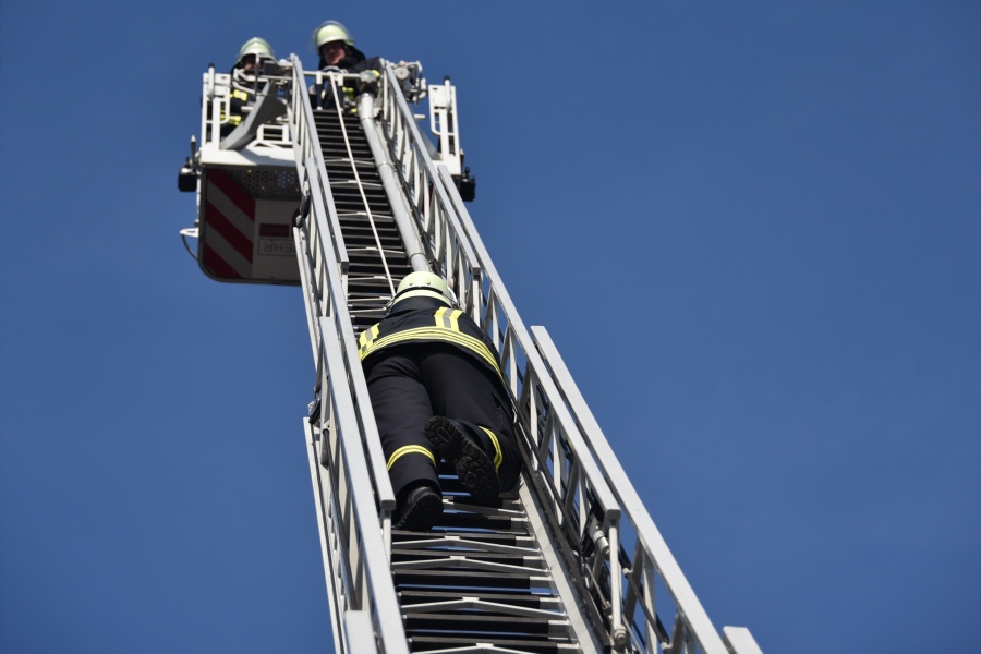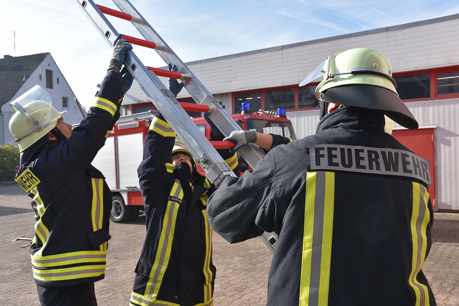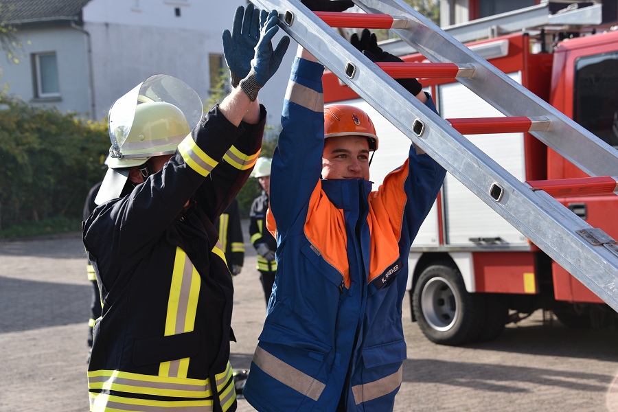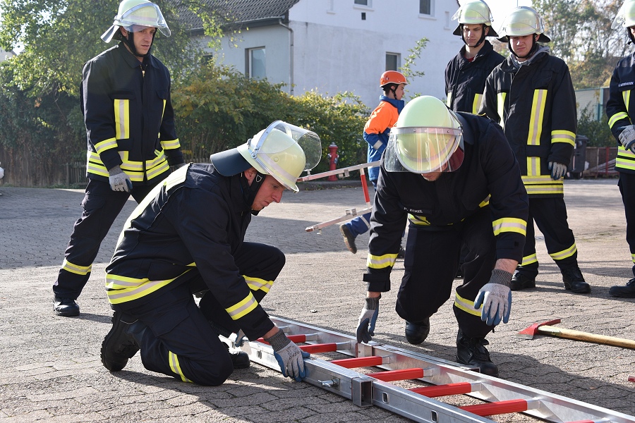 Vor allem das Arbeiten mit tragbaren Leitern, das Erlernen der Knoten und Stiche und der Einsatz beim Löschangriff haben dem 24-Jährigen gut gefallen. Es sei ein straffes Lernprogramm gewesen seit Ausbildungsbeginn am 08. Oktober, erklärt der Leiter der Feuerwehr, Jürgen Schmits beim Lehrgangsabschluss. 16 Ausbildungstage und -abende in weniger als vier Wochen galt es für die 20 Feuerwehrmänner zu bewältigen. Eine Frau war in diesem Lehrgang nicht dabei. Ein weiteres Novum war die Anzahl der Feuerwehrleute aus Ovenhausen, die am Lehrgang teilgenommen haben: acht junge Feuerwehrleute von der Löschgruppe Ovenhausen haben diesen Grundlehrgang mit geprägt. Nachwuchsprobleme habe die Ovenhäuser Wehr dank der zahlreichen Neueintritte momentan nicht. „Nun geht das Lernen erst richtig los“, sagte Schmits. Das Erlernte müsse nun in die Praxis umgesetzt werden, die erfahrenen Kameraden stünden den Neulingen dabei an der Seite, berichtet Schmits. Der Wehrleiter dankte sowohl den Teilnehmern, wie auch den Ausbildern für die unzähligen ehrenamtlich geleisteten Ausbildungsstunden. Bevor die Teilnehmer ihren Abschluss gefeiert haben, hieß es für die Unerschrockenen noch einmal Leiter steigen 25 Meter die Drehleiter hinauf.