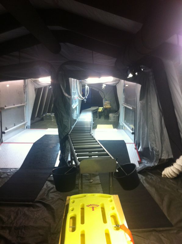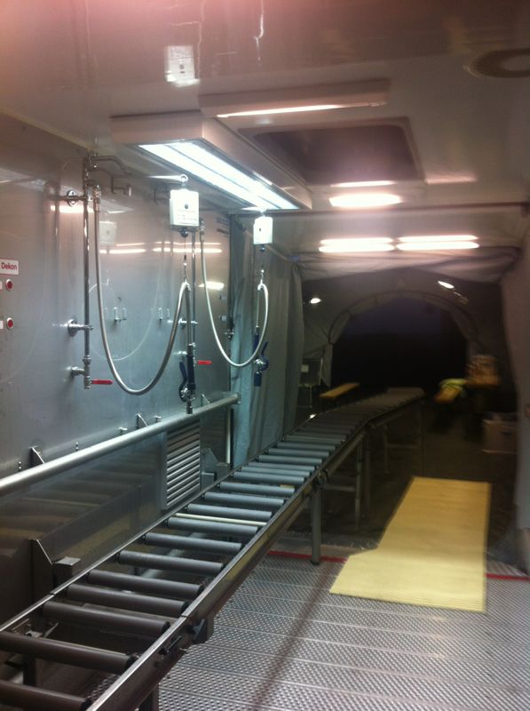 Der Abrollcontainer Dekon-V dient der Dekontamination von Verletzten (kurz: Dekon-V). Unter Dekontamination (kurz: Dekon), versteht man das Entfernen von gefährlichen Verunreinigungen (Kontaminationen) von Personen, Objekten oder ungeschützten Flächen und gehört damit zum ABC-Schutz. Die Gefährdungen können dabei radioaktiver, biologischer oder chemischer Natur sein. Weitere genaue Infos zum Aufbau des Dekon-V finden Sie unter: http://www.idf.nrw.de