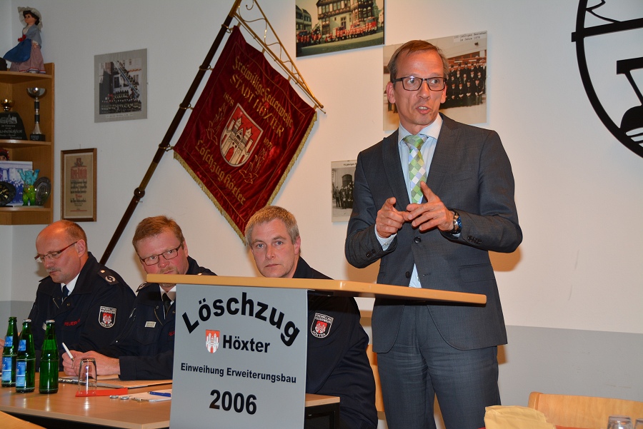 Im Namen des Rates und der Verwaltung der Stadt Höxter dankte Fischer ihm ganz herzlich für sein enormes ehrenamtliches Engagement. Fischer schätzt besonders seinen unermüdlichen Einsatz und Weiterbildungsdrang, den er durch den Besuch von dutzenden Lehrgängen und Seminaren bewiesen hat. Henne habe ausserdem den höchsten Dienstrang erhalten, den man als freiwilliger Feuerwehrmann erreichen kann. Als Nachfolger von Stadtbrandinspektor Henne ist Brandinspektor Jürgen Schmits durch einstimmiges Votum vom Rat der Stadt Höxter gewählt worden. "Bei den verschiedenen Meinungen der Parteien im Rat sei so ein einstimmiger Ratsbeschluss die Seltenheit", berichtet Bürgermeister Alexander Fischer. Jürgen Schmits wurde nun aufgrund des Ratsbeschlusses zum kommissarischen stellvertretenden Leiter der Feuerwehr Höxter ernannt für die Dauer von zwei Jahren. In dieser Zeit muss Schmits den sogenannten "F6-Lehrgang" absolvieren, der zur Leitung einer Feuerwehr benötigt wird. Auch Fachbereichsleiter Stefan Fellmann sprach Albert Henne seinen Dank aus für die jahrelange Erfolgsarbeit. Er dankte aber auch Jürgen Schmits, dass er das Amt von Henne übernommen hat.