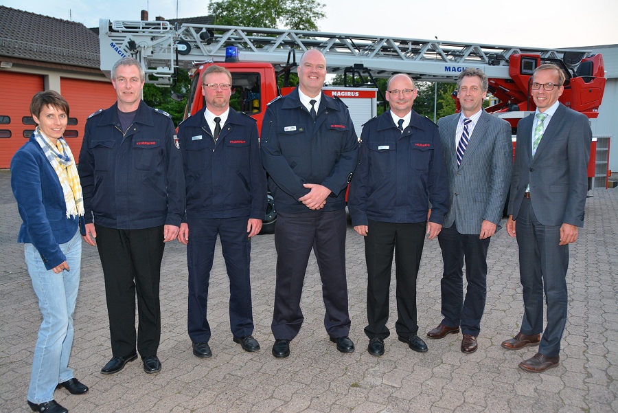 Von links: 1. Beigeordnete Maria Schmidt, Wehrführer Dieter Husemann, stellv. Wehrführer Norbert Rode, Jürgen Schmits, Albert Henne, Stefan Fellmann und Bürgermeister Alexander Fischer