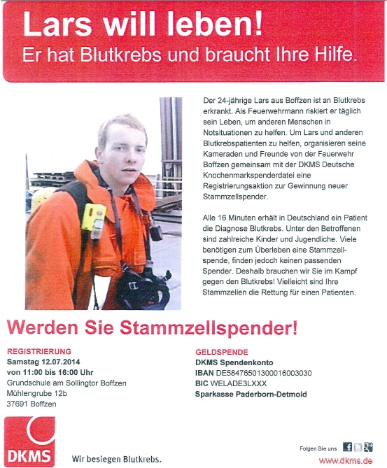 Die Familie von Lars freut sich jedenfalls riesig, dass sich so für ihn eingesetzt wird, sagt Thomas Danneberg, Feuerwehrkamerad und Freund der Familie. Die Aktion findet am Samstag, den 12. Juli von 11:00 bis 16:00 Uhr in der Grundschule am Sollingtor in Boffzen statt in der Mühlengrube 12b. Eine Stammzellenspende kann Menschenleben retten und ist ungefährlicher und einfacher als gedacht, sagt Thomas Danneberg. Die DKMS ist bei der Spenderneugewinnung allein auf Geldspenden angewiesen. Die Registrierung und Typisierung eines Spenders verursacht Unkosten von etwa 50 Euro pro Person. Es wird mit etwa 1000 Personen gerechnet, die am 12. Juli zur Typisierung erscheinen. Deshalb zählt für die Aktion jeder Euro, sagt der stellvertretende Ortsbrandmeister Thorsten Reim. 865 Euro sind bereits spontan auf dem Feuerwehrfest Boffzen im Festzelt gesammelt worden, die in den Topf einfließen. Weitere Informationen finden Sie auch auf der Internetseite www.dkms.de. Alle 16 Minuten erhält in Deutschland ein Patient die Diagnose Blutkrebs. Unter den Betroffenen sind zahlreiche Kinder und Jugendliche. Viele benötigen zum Überleben eine Stammzellenspende, finden jedoch keinen passenden Spender. Nähere Infos und was auf einen zukommt findet man auf der Internetseite www.DKMS.de. Das Spendenkonto für die DKMS-Aktion lautet: IBAN: DE58476501300016003030 / BIC: WELADE3LXXX