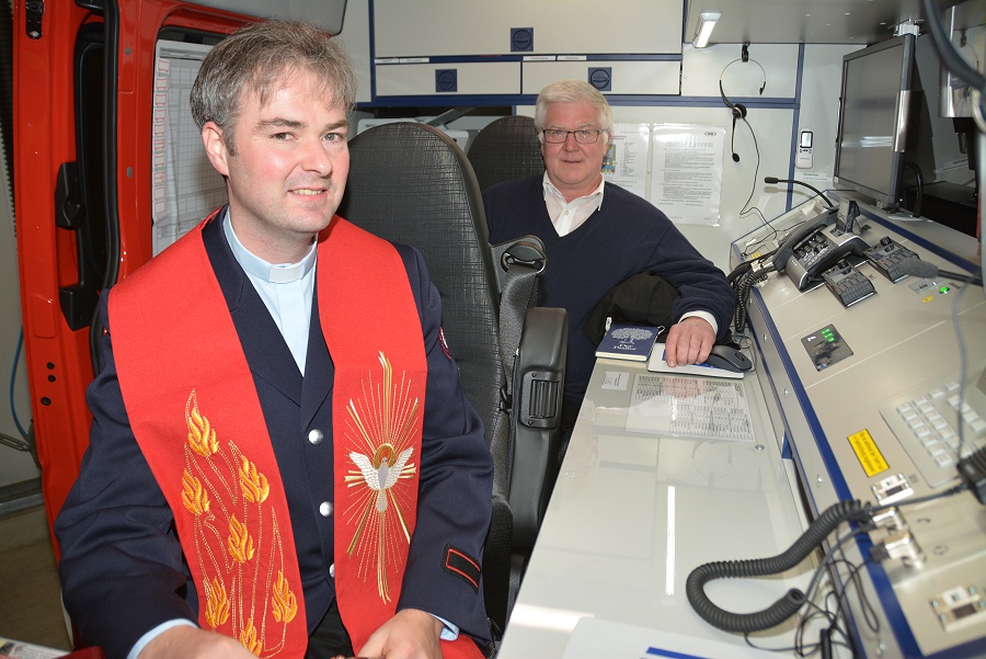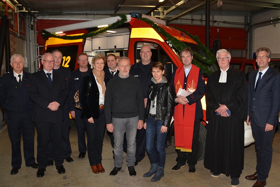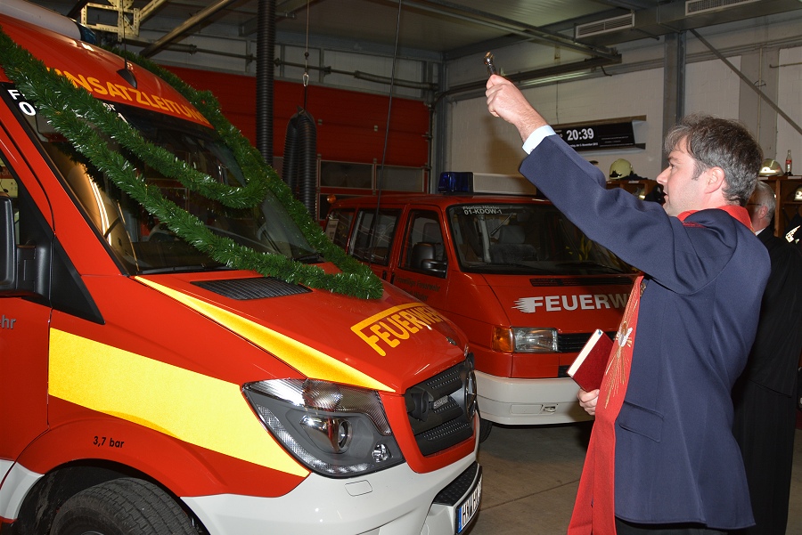 Höxter / 03.11.2015 (TKu). Stadtbrandinspektor Jürgen Schmits ist erleichtert: Endlich erhielt der neu angeschaffte Einsatzleitwagen seinen kirchlichen Segen bei der feierlichen Übergabe an die Freiwillige Feuerwehr Höxter. "Somit dürfte beim Einsatz des Fahrzeuges auch nichts mehr schiefgehen", sagte der stellvertretende Wehrführer Jürgen Schmits. Denn zwei Einsätze und eine Großübung hat der Wagen als Führungsfahrzeug bereits hinter sich, nachdem dem er im Oktober vom Hersteller abgeholt worden ist. Der neue Einsatzleitwagen, kurz: "ELW-1" genannt, ersetzt einen 23 Jahre alten Kommandowagen auf VW-T4-Fahrgestell.