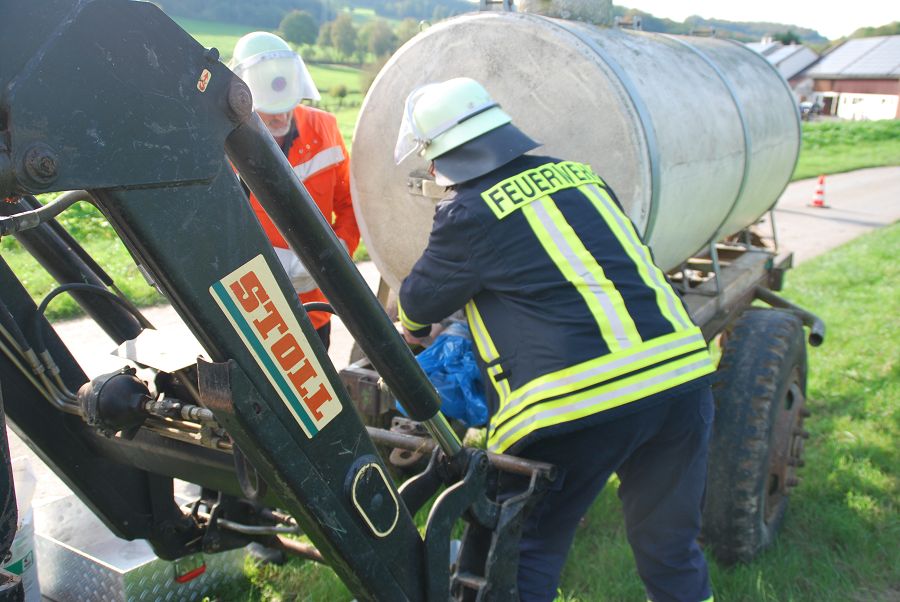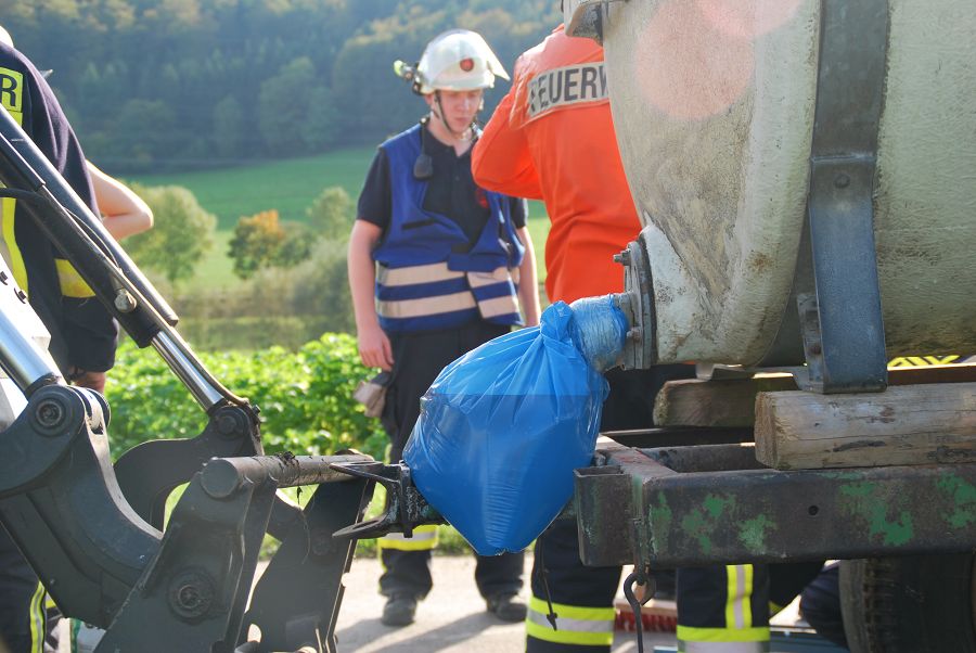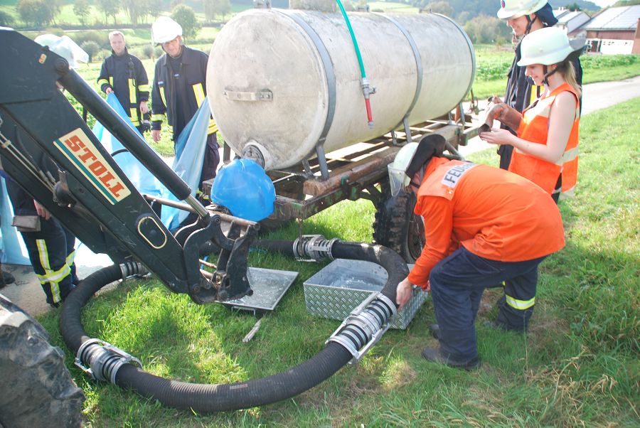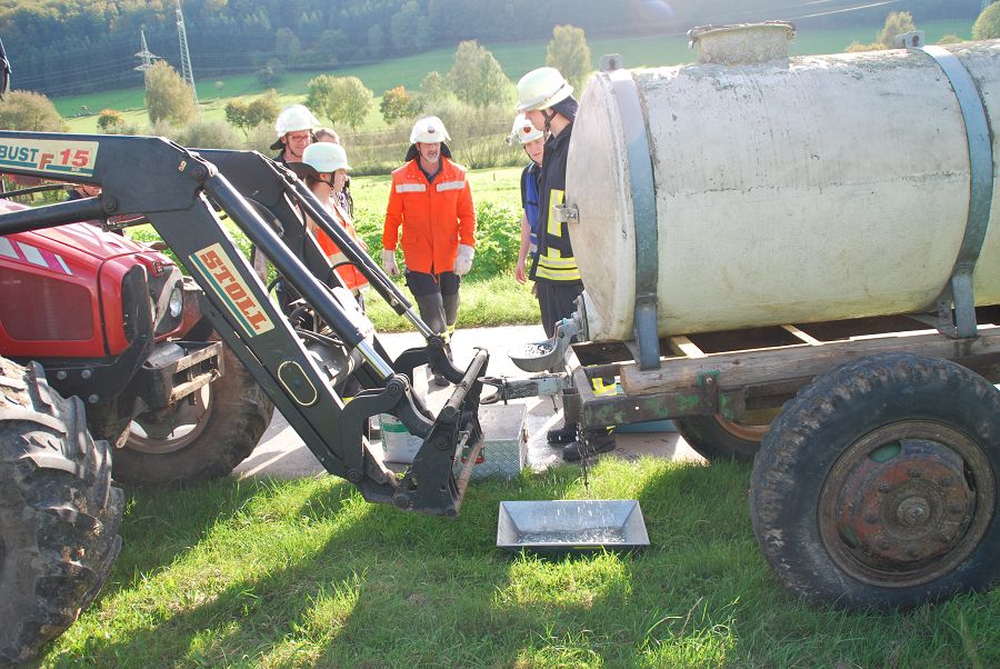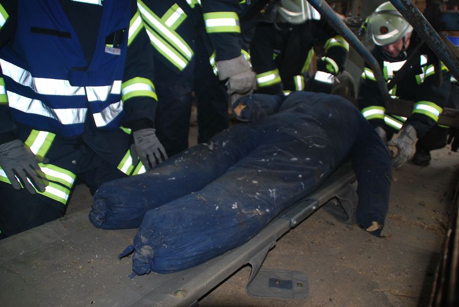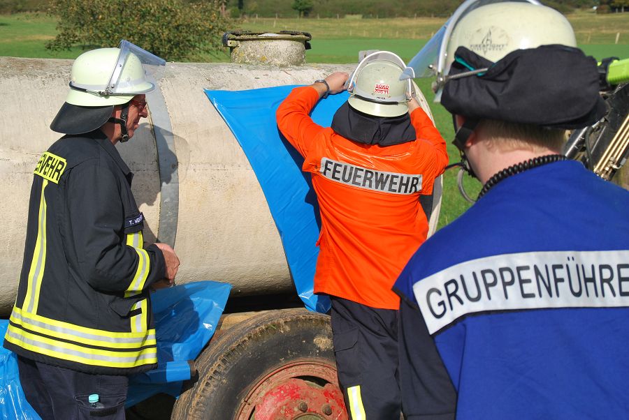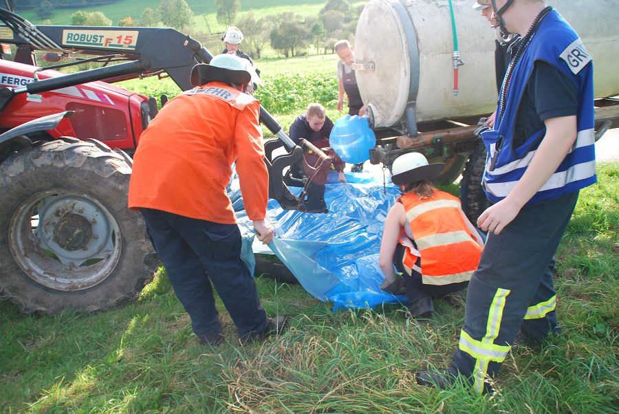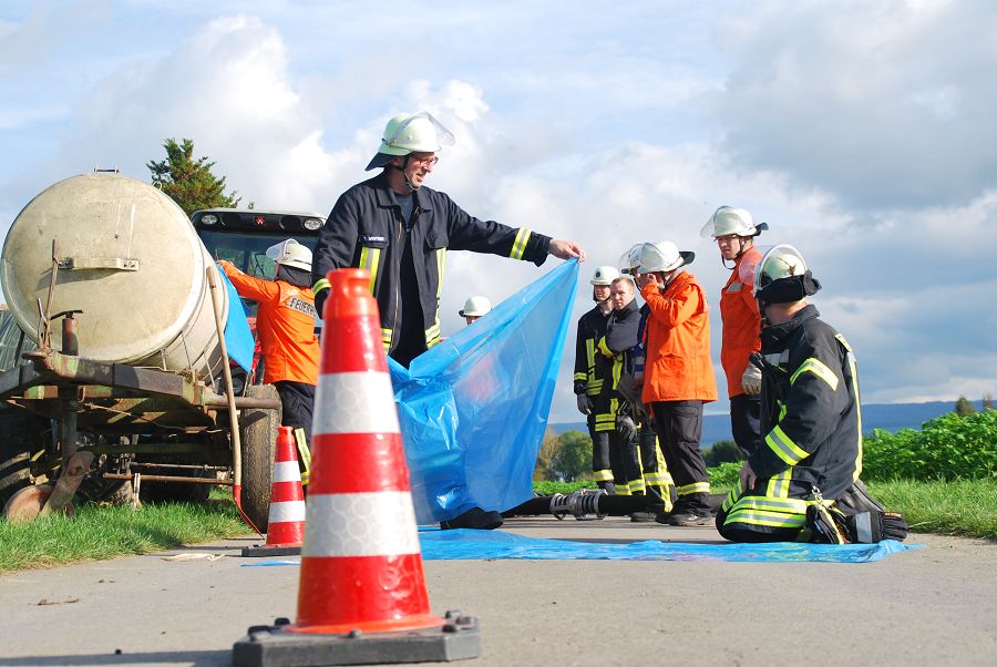Denn auch den erfahrenen Kameraden ohne F3-Qualifikation kann es passieren, das sie im Einsatz plötzlich den Gruppenführerposten übernehmen müssen. Folgende Übungsszenarien wurden nacheinander abgearbeitet: Person unter einem Holzstapel eingeklemmt, Garagenbrand mit einer vermissten Person, Menschenrettung aus Steinbruch (zwei Personen abgestürzt, eine davon nicht mehr ansprechbar und die zweite Person verwirrt), Menschenrettung einer bewusstlosen Person vom Dach (Rettung per Leiterhebel), Technische Hilfeleistung nach Verkehrsunfall mit Traktor (Traktor mit Tankwagen kollidiert, Flüssigkeit läuft aus und muss aufgefangen werden) sowie zu guter letzt ein Großbrand mit stark verrauchtem Gebäude und einer vermissten Person im Wohnhaus.