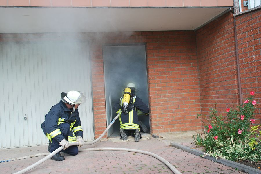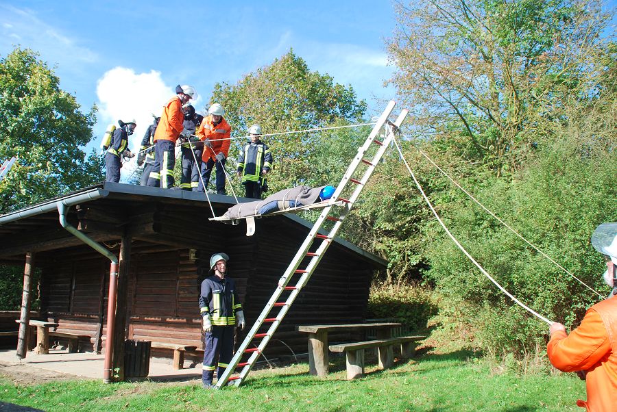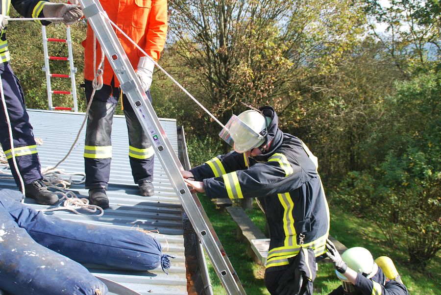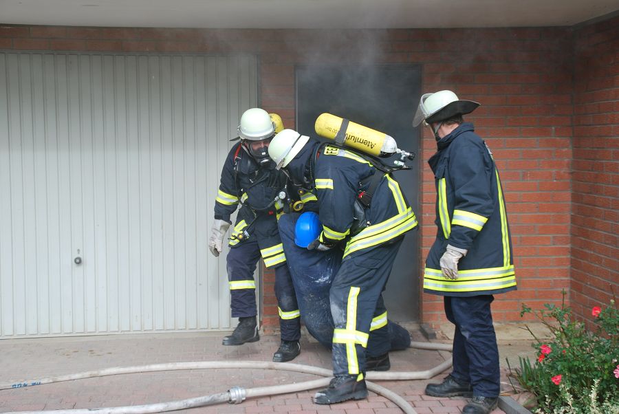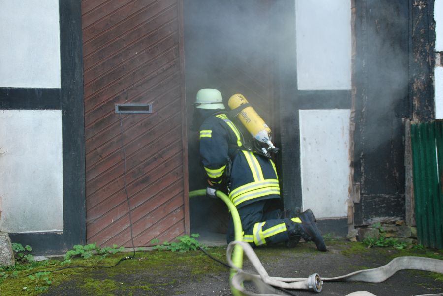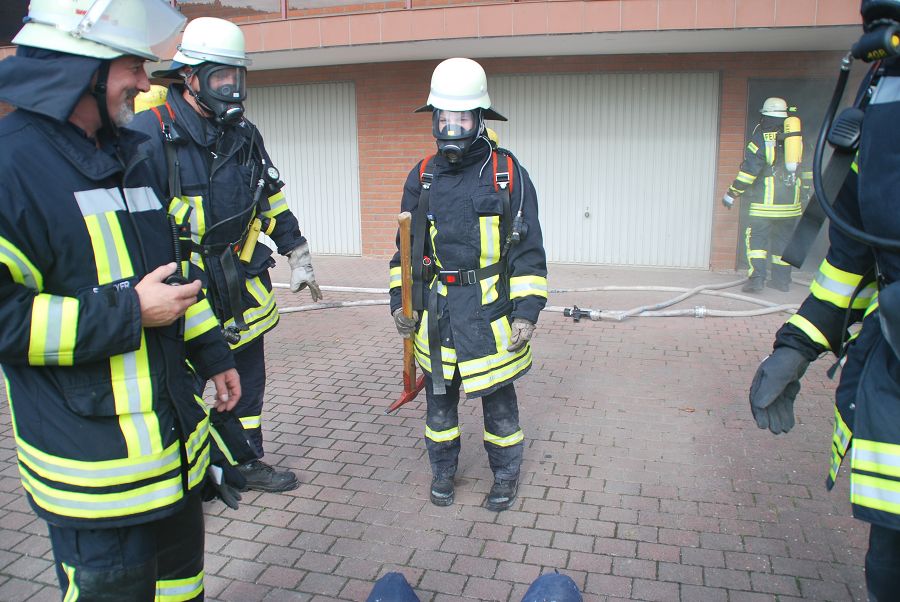 Dazu wurden gleich zwei Trupps zur Menschenrettung unter Atemschutz vorgeschickt. Weil die Treppe eingestürzt und einem vorgegangenen Trupp der Rückweg abgeschnitten sein sollte, musste von außen die Steckleiter vorgenommen werden um den Rückweg zu sichern. Angenommen wurde auch der Ausfall eines Kameraden im Innenangriff mit dem Alarm "Mayday", um die Situation spannender zu gestalten. Für ihre Einsätze stand der Löschgruppe nur ihr Tragkraftspritzenfahrzeug zur Verfügung, daher mussten sie bei einigen Einsätzen sehr ideenreich arbeiten und auch improvisieren. Nach jeder Übung gab es eine kurze Nachbesprechung, um Fehler zu erkennen und gemeinsam Verbesserungen zu erörtern. Am Ende des Tages waren die Kameraden nicht nur geschafft, sie waren sich auch alle einig, dass der Tag ausbildungstechnisch sehr viel gebracht hätte.