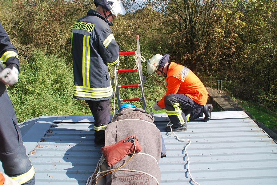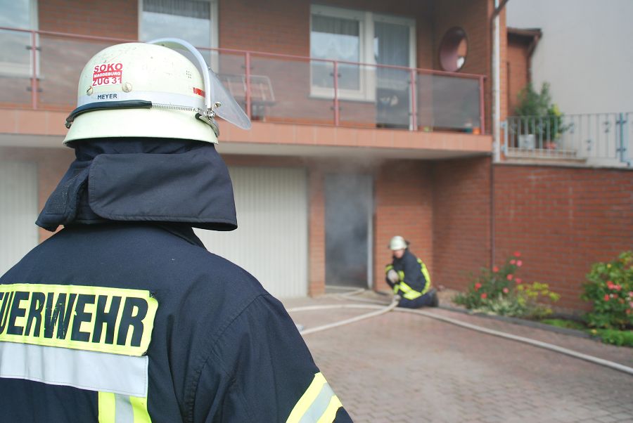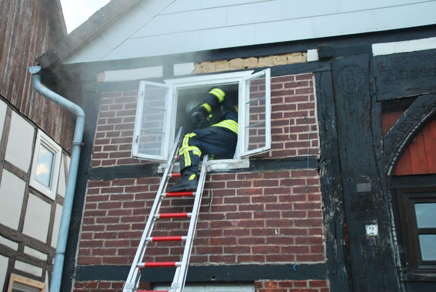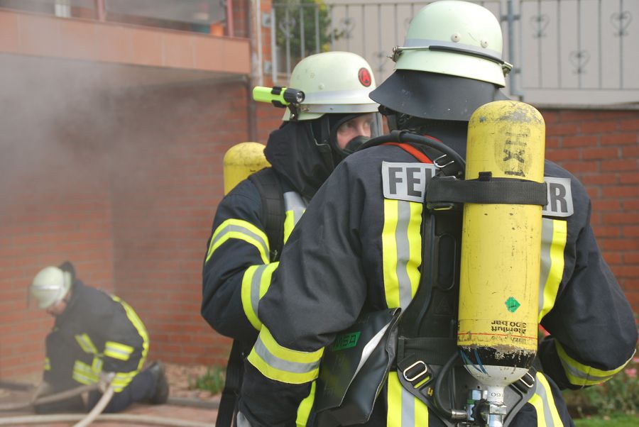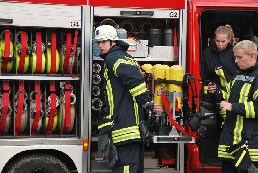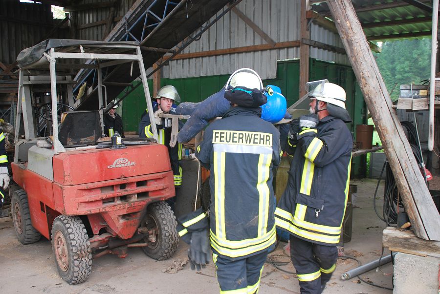 Dazu wurden gleich zwei Trupps zur Menschenrettung unter Atemschutz vorgeschickt. Weil die Treppe eingestürzt und einem vorgegangenen Trupp der Rückweg abgeschnitten sein sollte, musste von außen die Steckleiter vorgenommen werden um den Rückweg zu sichern. Angenommen wurde auch der Ausfall eines Kameraden im Innenangriff mit dem Alarm "Mayday", um die Situation spannender zu gestalten. Für ihre Einsätze stand der Löschgruppe nur ihr Tragkraftspritzenfahrzeug zur Verfügung, daher mussten sie bei einigen Einsätzen sehr ideenreich arbeiten und auch improvisieren. Nach jeder Übung gab es eine kurze Nachbesprechung, um Fehler zu erkennen und gemeinsam Verbesserungen zu erörtern. Am Ende des Tages waren die Kameraden nicht nur geschafft, sie waren sich auch alle einig, dass der Tag ausbildungstechnisch sehr viel gebracht hätte.