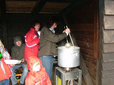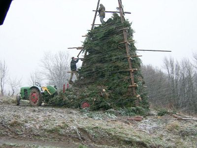 Bödexen / 15. / 21.03.2008 (MR) Wie auch bereits in den vergangenen Jahren fing die Löschgruppe Bödexen eine Woche vor Ostern an das Gerüst für das Osterfeuer aufzustellen. Dazu ging es am Samstag morgen mit drei Treckern in den Wald Richtung Bröken. Dort wurden die passenden Stämme für das Dreieck aus den vom Sturm umgeknickten Bäumen ausgesucht. Das aufstellen des Dreieck war schwieriger als in den letzten Jahren da die Stämme dicker und auch länger waren. Aber schließlich hat es dann doch geklappt. Ein paar Querstreben zur Stabilisierung wurden noch angebracht sodass eine Woche später mit dem befüllen begonnen werden konnte. Bei Wind, Regen und einem kurzen Schneeschauer wurde dann das Dreieck mit Tannen befüllt. Zwischendurch gab es eine warme Suppe, gestiftet von den Frauen des alten Hofstaates.