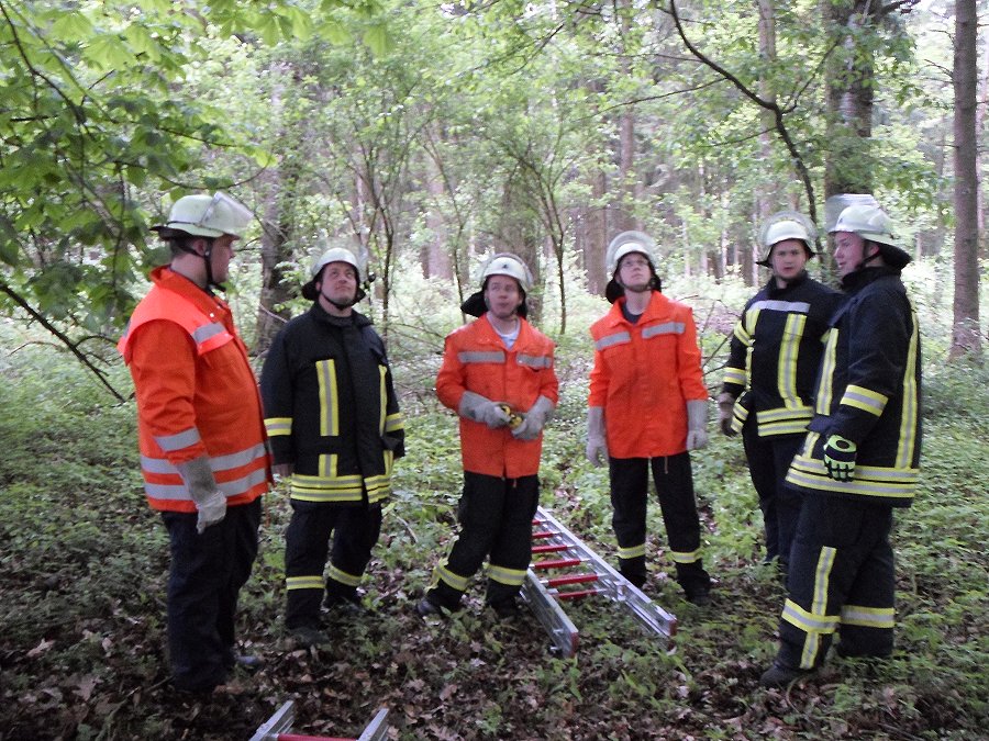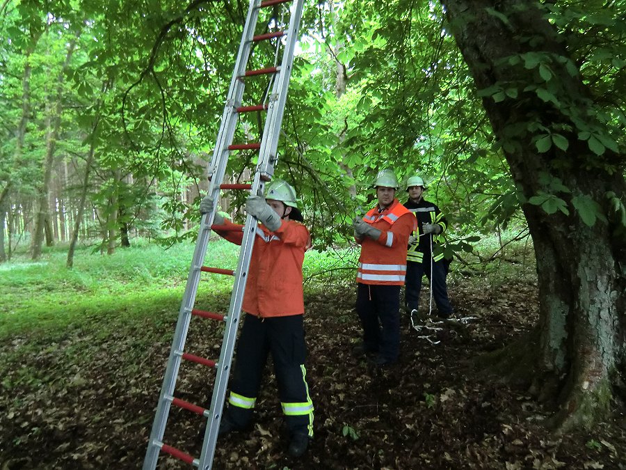 Bödexen / 21.05.2013 (MR) Die Feuerwehrdienstvorschrift 10 (Tragbare Leitern) war Thema beim Übungsdienst der Löschgruppe Bödexen. Um das Thema mit Leben zu füllen wurde ein Fallspringerunfall in der Nähe des Flugplatzes auf dem Räuschenberg angenommen, bei dem die tragbaren Leitern eingesetzt werden mussten. Ein Springer sollte in etwa 6 Metern Höhe in einem Baumwipfel gelandet sein. Die verletzte Person war jedoch nicht mehr in der Lage, eine Leiter von selbst abzusteigen, weil sie sich durch die harte Landung beide Beine gebrochen hatte. Als Ausrüstung stand der Löschgruppe nur ihr Tragkraftspritzenfahrzeug (TSF-W) mit Normbeladung zur Verfügung.