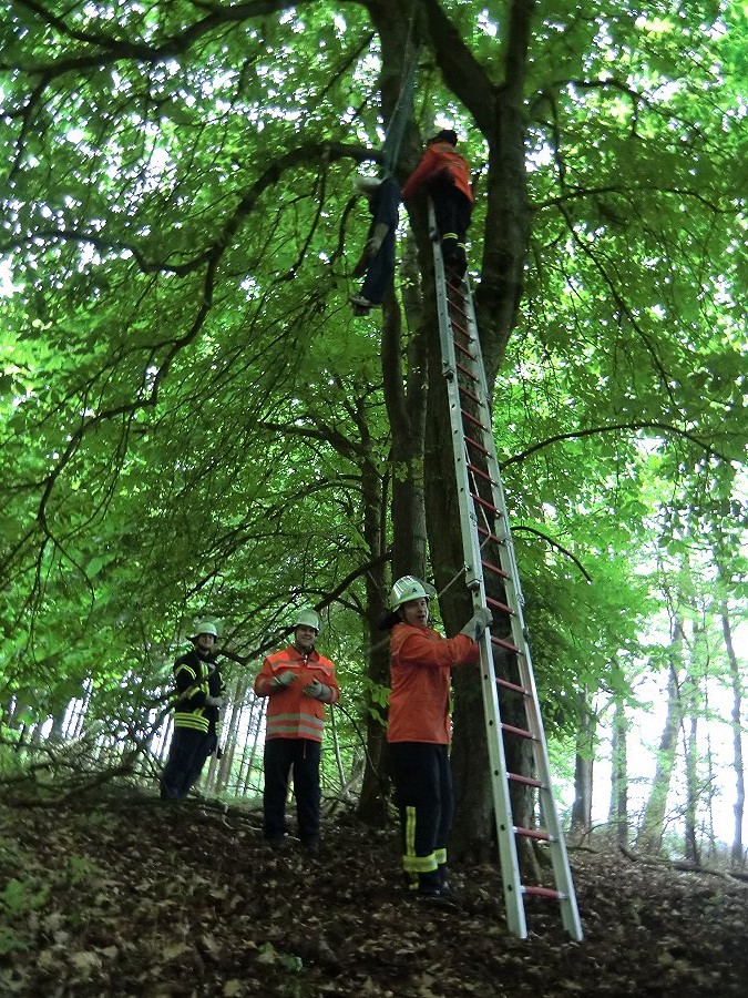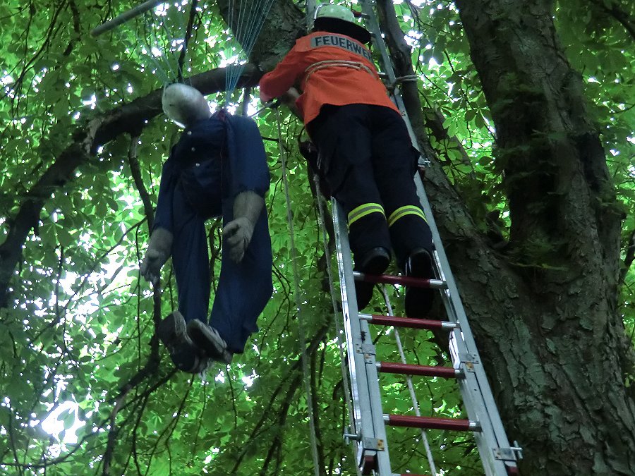 Über die Möglichkeit zur Rettung sollte sich bei dieser Übung aber nicht nur der Gruppenführer Gedanken machen, sondern in erster Linie die Gruppe selbst, was u.a. eine Besonderheit dieser Übung darstellte. Gemeinsam konnte die Lage dann sicher, schnell und taktisch einwandfrei abgearbeitet werden. Dabei wurde natürlich auch auf die Sicherheit der eigenen Kameraden geachtet indem z.B. der aufsteigende Feuerwehrmann mit einem Rettungsknoten gesichert wurde. Oben im Wipfel wurde die verletzte Person dann ebenfalls mit einer Feuerwehrleine gesichert. Nachdem dann die Seile zum Fallschirm durchgetrennt worden waren, konnte der Fallschirmspringer langsam und sicher mittels Feuerwehrleine zu Boden gelassen werden. Fazit der Übung: Es ist durchaus möglich mit der Beladung eines TSF-W und einer Staffelbesatzung einen verletzten Fallschirmspringer oder Gleitschirmflieger aus einem Baum zu Retten.