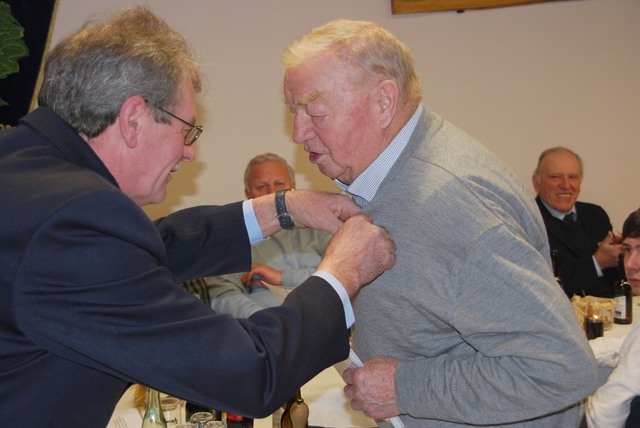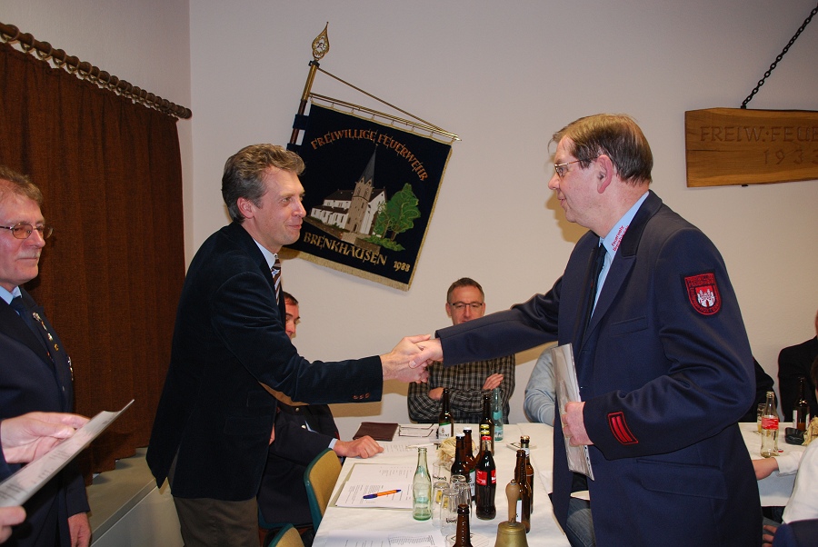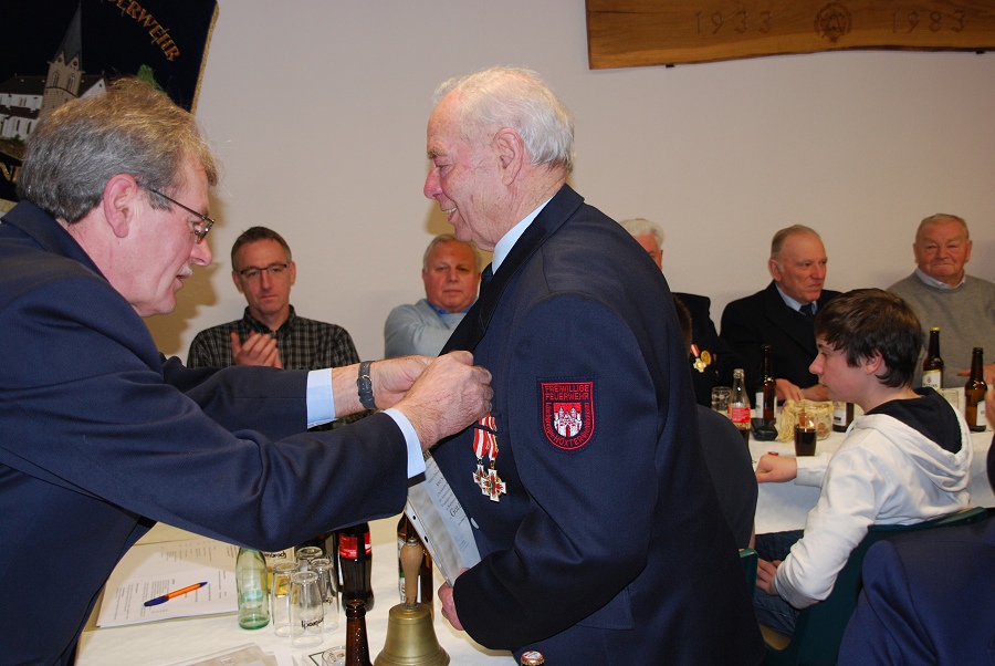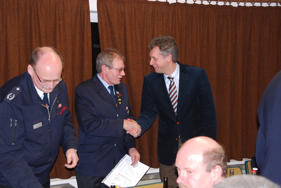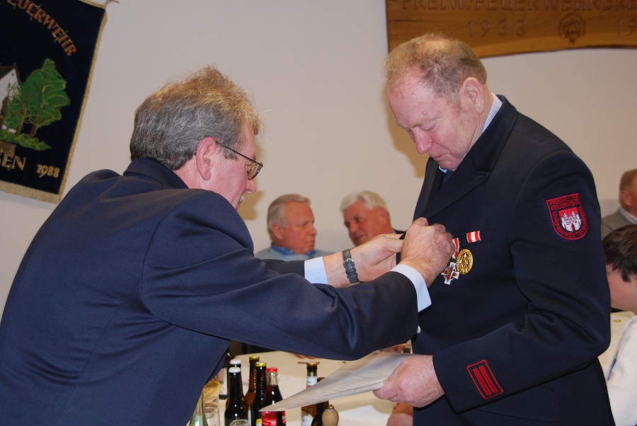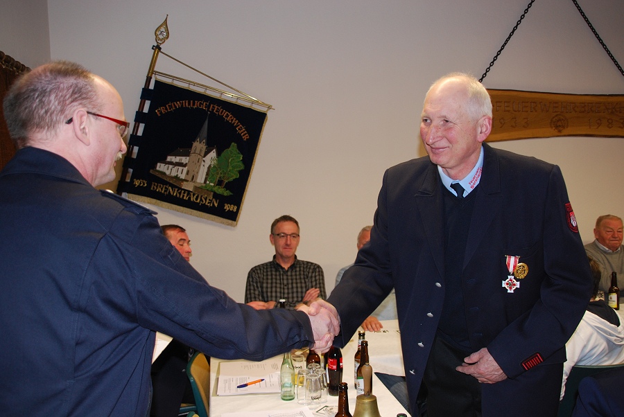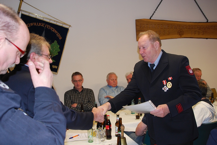 Gemeinsam sind sie durch schöne aber auch schwierige Jahre gegangen, was Personalmangel und die Ausstattung der Wehr betrifft. Gemeint ist die Zeit, als der Anhänger mit der Motorspritze noch von einem Trecker gezogen werden musste, erklärt Jubilar Hubert Cors. Für ihre langjährige Treue zur Feuerwehr erhielten diese zehn Kameraden das Sonderabzeichen des Verbandes der Feuerwehren in Gold. Das Abzeichen für 60-jährige Mitgliedschaft in der Feuerwehr wurde durch den stellvertretenden Wehrführer Albert Henne und Löschgruppenführer Georg Drüke an die Oberfeuerwehrmänner Franz Mönnekes, Josef Schreier, Johannes Voß, Engelbert Sauer und den Brandmeister Ferdinand von Kölln verliehen. Das Sonderabzeichen für 50 Jahre Mitgliedschaft erhielten Brandmeister Hubert Cors, Hauptfeuerwehrmann Johannes Ferlemann und die Oberfeuerwehrmänner Roland Arndt, Willi Schrader sowie Hermann Schröder. Fachbereichsleiter Stefan Fellmann dankte den Jubilaren im Namen der Stadt Höxter. Der Ortsratsvorsitzende Martin Finke und der Bezirksverwaltungsstellenleiter Johannes Hüls schlossen sich den Dankesworten an.