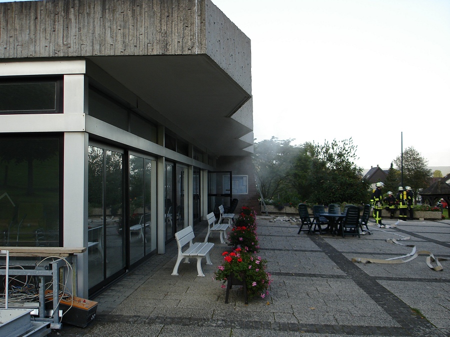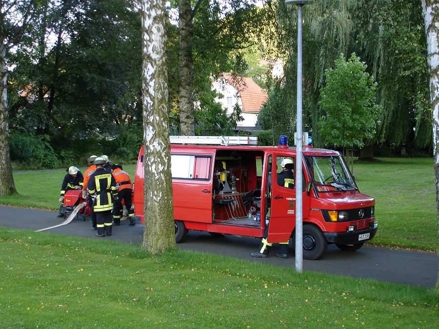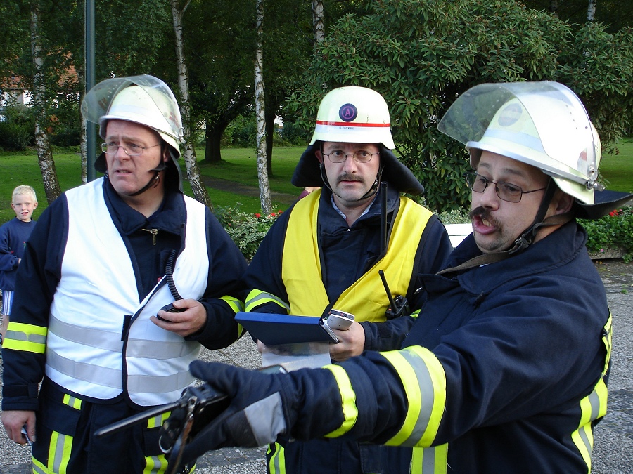 Bruchhausen / 08.09.2006 (TKu) Sirenengeheul schreckte die Bürgerinnen und Bürger von Bruchhausen am Freitagabend plötzlich auf. "Es brennt im Kurmittelhaus in Bruchhausen, zwei Personen werden noch vermisst", lautete die erste Einsatzmeldung der Leitstelle beim Nachfragen der Feuerwehrleute aus Bruchhausen über Funk. Zum Glück sollte es sich dabei jedoch nur um eine Alarmübung des Löschzuges 5, bestehend aus den Löschgruppen Bruchhausen, Godelheim und Ottbergen, handeln. Im Vordergrund stand zunächst die Menschenrettung. Drei Trupps gingen dazu unter schwerem Atemschutz ins total verqualmte Gebäude vor.