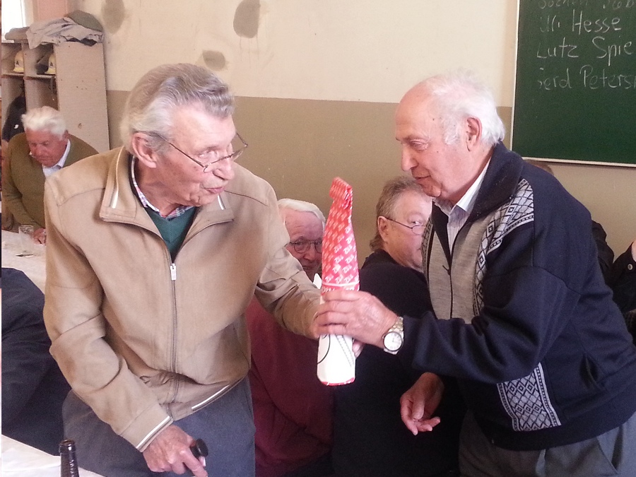 Horst Hoppe überreicht dem ältesten Teilnehmer Johannes Kieneke ein Präsent