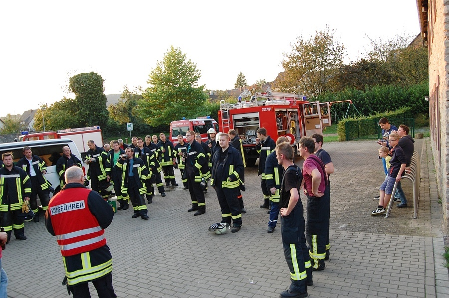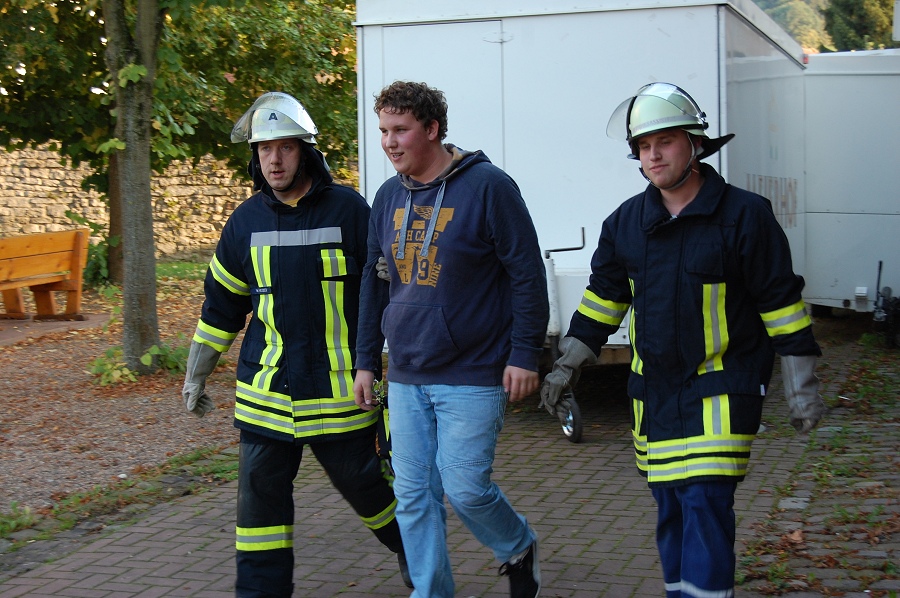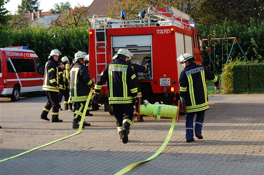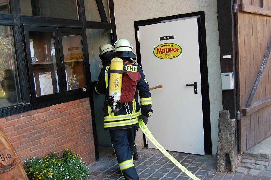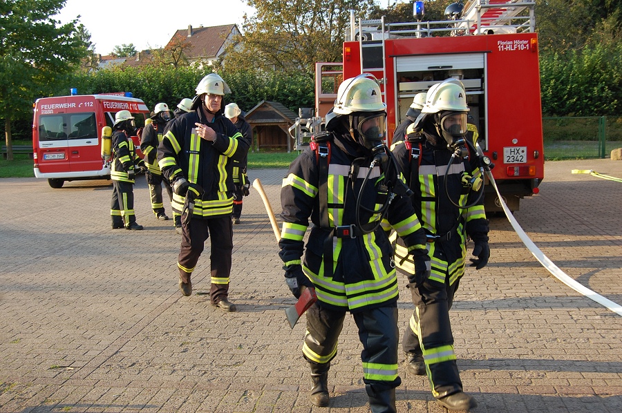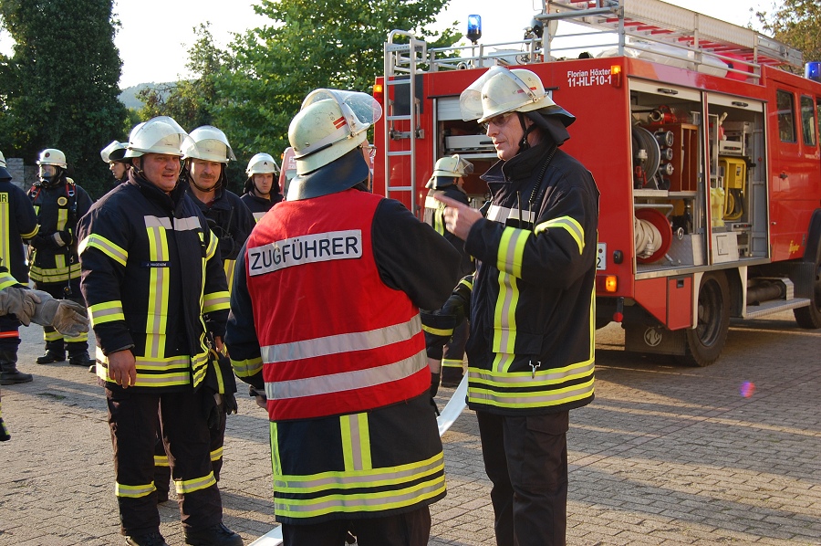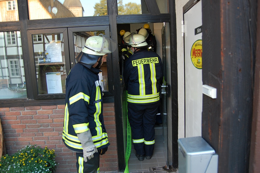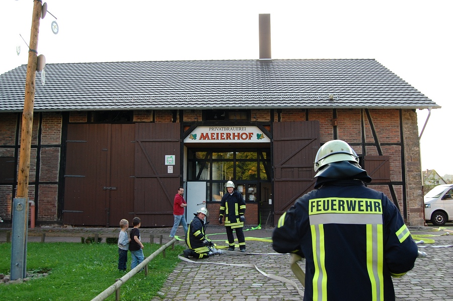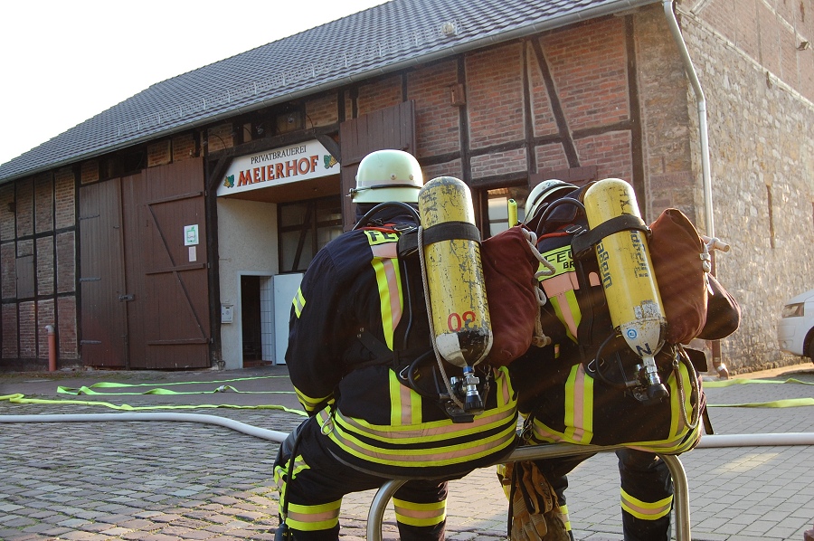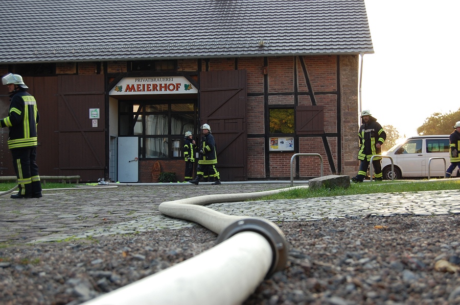 Ottbergen / 03.09.2014 (TKu) Feuer in der Meierhof-Brauerei: Die Schrotmühle brennt, eine Besuchergruppe von fünf Personen befindet sich noch im Gebäude! Diese angenommene Lage war Ausgang für eine geheime Alarmübung in der Meierhof-Brauerei in Ottbergen, an dem die Löschgruppen Bruchhausen, Godelheim und Ottbergen beteiligt waren. Nach Erkundung der Einsatzlage werden gleich zwei Atemschutztrupps mit Hohlstrahlrohr zur Menschenrettung ins Gebäude geschickt, während Sicherheitstrupps außen in Bereitstellung gehen. Von der hinteren Gebäudeseite wird ein B-Hohlstrahlrohr von der Löschgruppe Godelheim vorgenommen.