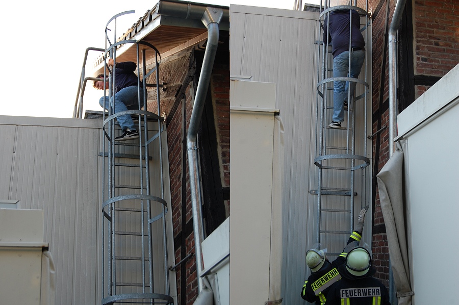Menschen bringen sich über die Feuerleiter in Sicherheit