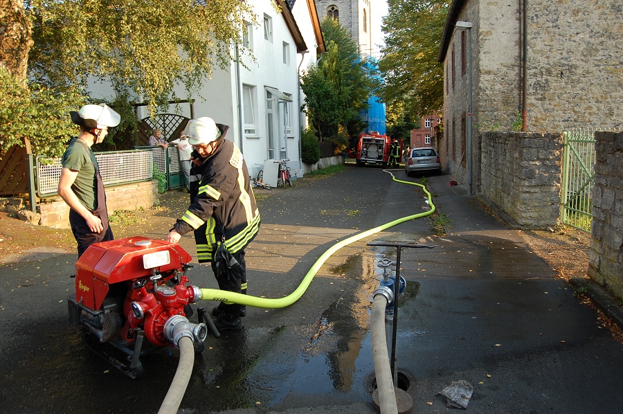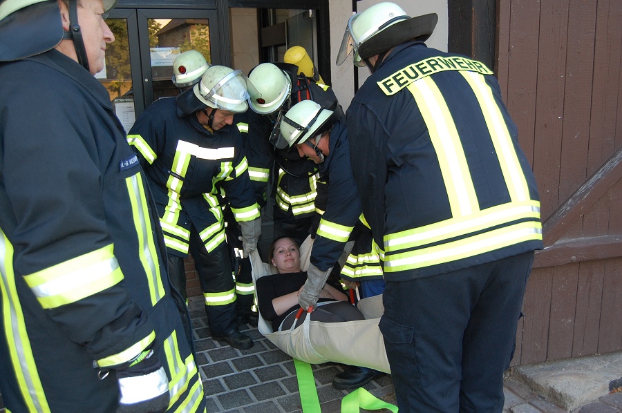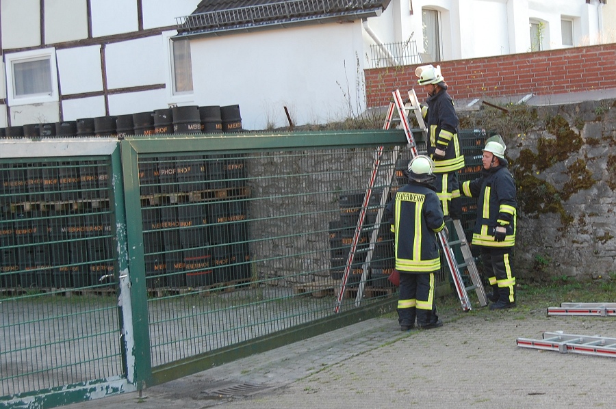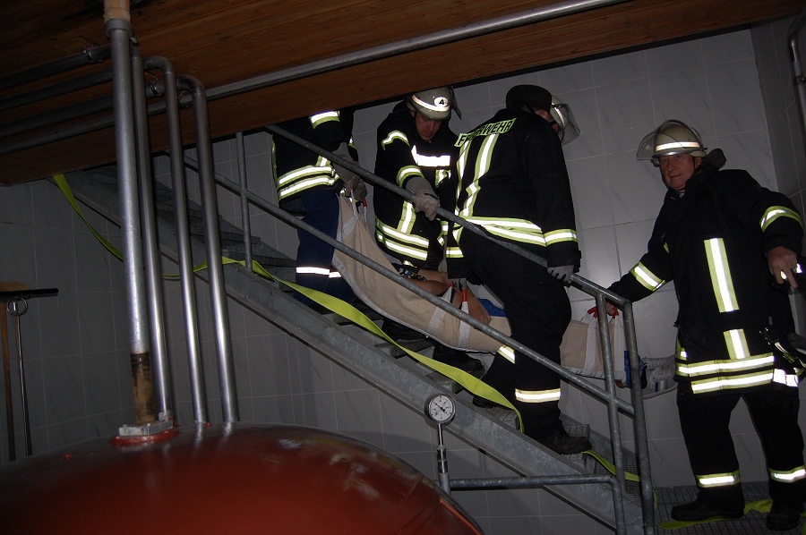 Ein provisorischer Wasserwerfer wird zur Kühlung eines Gastanks in Stellung gebracht. Während die Löschgruppe Ottbergen die Menschenrettung einleitet, wird die Löschgruppe Bruchhausen mit der Sicherstellung der Wasserversorgung beauftragt. Drei gehfähige Personen können über eine Feuerleiter vom Dach gerettet werden, zwei weitere Personen retten die Feuerwehrleute mit einem Rettungstuch durch das Treppenhaus der Brauerei. Löschzugführer Franz-Josef Potthast war mit dem Ergebnis der Übung sehr zufrieden. "Keiner der Feuerwehrleute hat etwas von der Übung geahnt und dennoch hat alles gut funktioniert", sagt Löschzugführer Potthast. Ein besonderes Dankeschön geht an die Meierhof-Brauerei Ottbergen für Übungsmöglichkeit im Brauereigebäude.