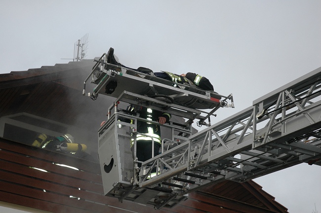 Nach der Erkundung geht alles sehr schnell. Die Drehleiter wird in Stellung gebracht und die Frau vom Balkon gerettet. Zeitgleich gehen Trupps unter Atemschutz ins Gebäude zur Menschenrettung und Brandbekämpfung vor. Drei verletzte Menschen können aus dem Haus nach draußen in Sicherheit gebracht werden, daher wird mittels Schnelleinsatzzelt eine provisorische Verletztensammelstelle eingerichtet. Der pflegebedürftige Mann wird von einem Atemschutz-Trupp auf den Balkon getragen, von wo aus er mit dem Tragegestell der Drehleiter nach unten geholt wird. Insgesamt klappte die Übung soweit ganz gut, sechs Personen konnten gerettet und der Brand gelöscht werden. Als problematisch waren die beengten Platzverhältnisse, die jedoch von den Feuerwehrleuten dennoch gut gemeistert wurden. Das Übungsgelände war gut ausgewählt, soll doch hier alles abgerissen werden und ein neues großes Einkaufszentrum gebaut werden.