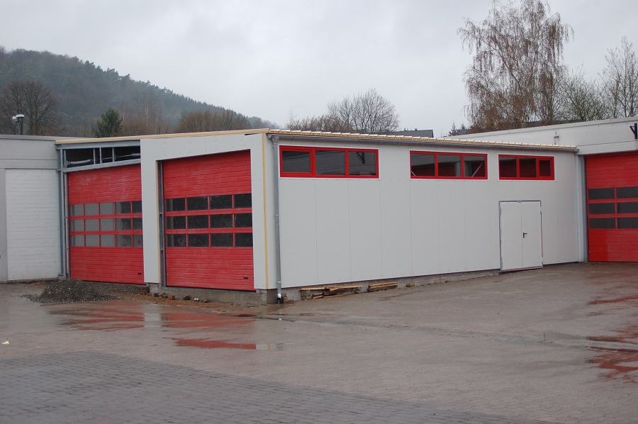 Höxter / 27.09.2006 (TKu) Der Löschzug Höxter verfügt seit September 2006 über einen modernen Gerätehaus-Anbau mit zwei neuen großen Stellplätzen für die Einsatzfahrzeuge. Im Beisein zahlreicher Ehrengäste wurde der neue Fahrzeughallenanbau nun offiziell eingeweiht und seiner Bestimmung übergeben. Der Anbau war notwendig geworden, um die Sicherheit des Dienstbetriebes in der bisher beengten Fahrzeughalle zu gewährleisten. Mehr als 40.000 Euro investierte die Stadt Höxter bisher in das Projekt. Der Kreis Höxter beteiligte sich noch mal mit rund 10.000 Euro, weil der ELW 2 des Kreises Höxter seit etwa zwei Jahren beim Löschzug Höxter untergebracht ist. Die Bauzeit dauerte von November 2005 bis September 2006.