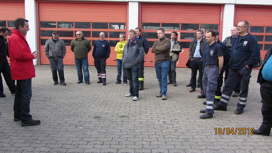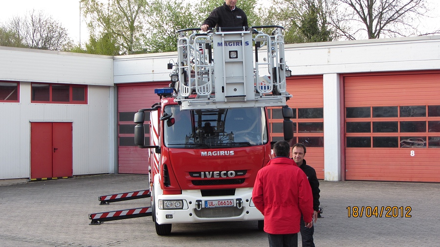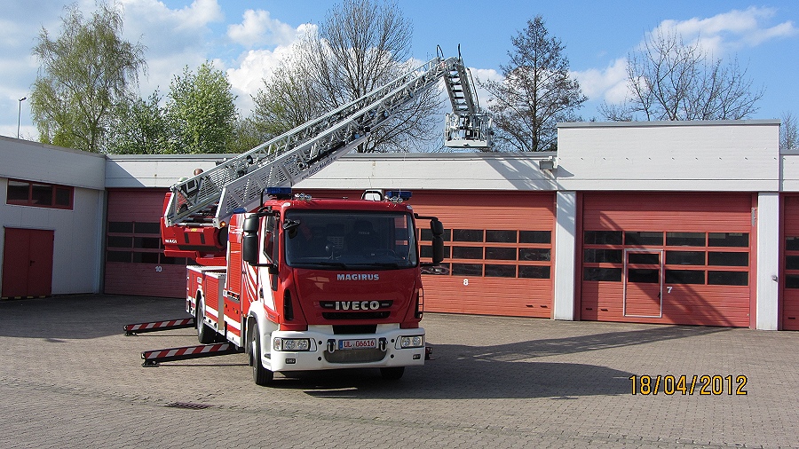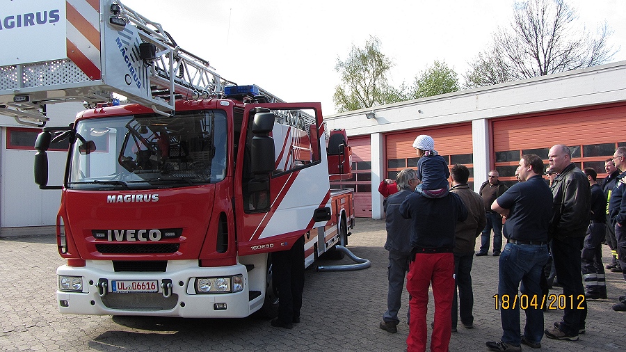 Höxter / 18.04.2012 (TKu) Vorführung beim Löschzug Höxter: Eine neue Drehleiter von IVECO-Magirus wurde nun den Kameraden, Führungskräften, Gerätewarten, Drehleitermaschinisten und Vertretern der Stadt an der Feuer- und Rettungswache Höxter vorgestellt. Mit von der Partie war auch eine Delegation der Ortsfeuerwehr Holzminden. Drehleitern (sie zählen zu den Hubrettungsfahrzeugen) sind Fahrzeuge, die vor allem zur Rettung von Menschen aus Notlagen, aber auch zur Durchführung technischer Hilfeleistungen und zur Brandbekämpfung verwendet werden.