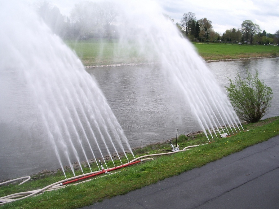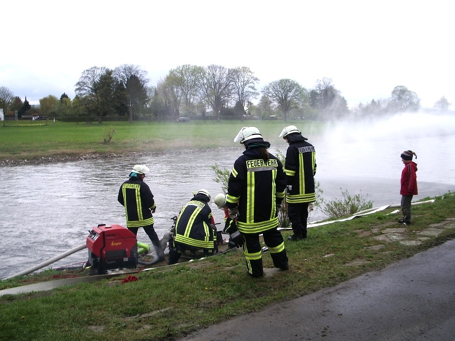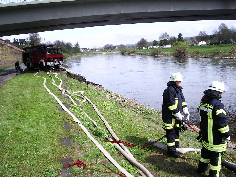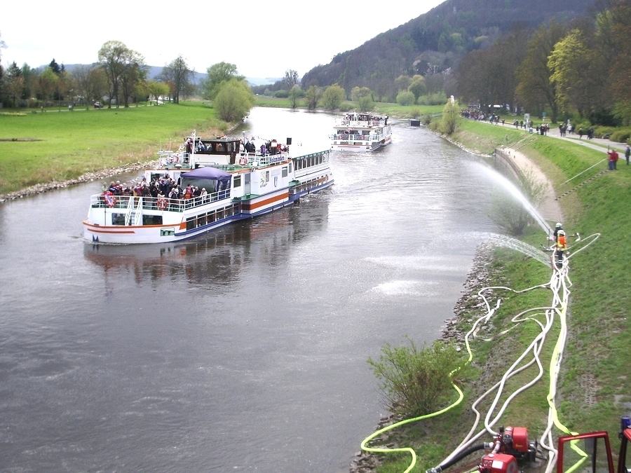 Höxter / 21.04.2012 (TKu) Die Saisoneröffnung der Flotte Weser wäre ohne die Wasserspiele vom Löschzug Höxter mittlerweile undenkbar. Es ist schon seit Jahren eine feste Tradition, dass sich die Feuerwehr an dem Spektakel beteiligt. 10 Kameraden des Löschzuges Höxter waren mit drei Fahrzeugen unterhalb der Weserbrücke für die Wasserspiele im Einsatz. Nach Programm am Dampferanleger verabschiedeten sich die Schiffe um 14.00 Uhr in Richtung Corvey und Holzminden.