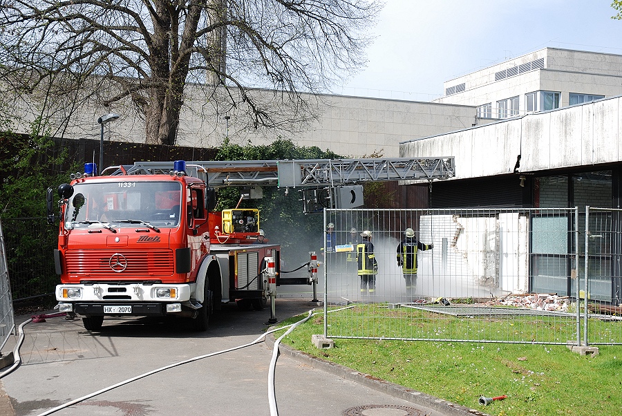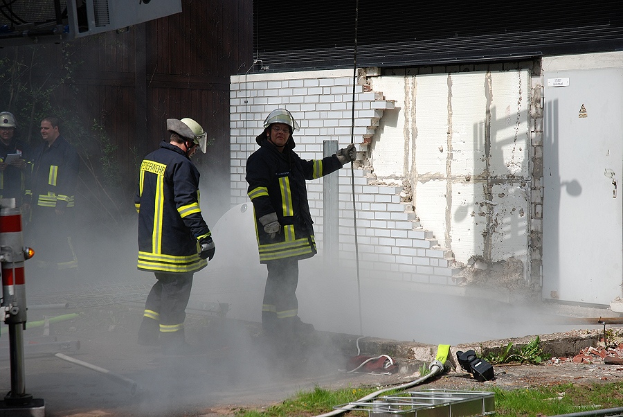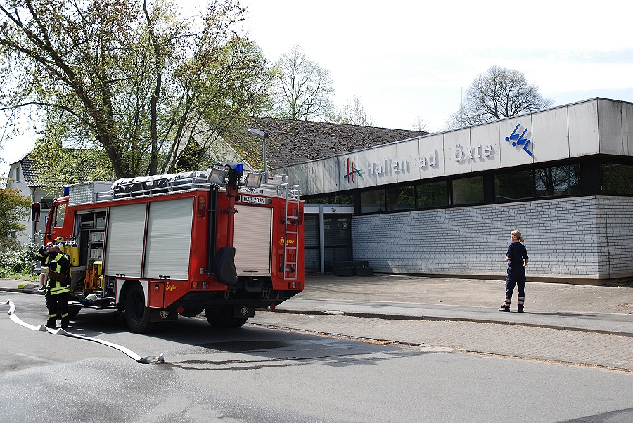 Höxter / 28.04.2012 (TKu) Das Hallenbad Höxter brennt! Ein Feuer im Keller des Schwimmbades mit starker Rauchentwicklung und vier vermissten Personen war die Ausgangslage für die letzte Einsatzübung des Löschzuges Höxter an dem Objekt Hallenbad, das in wenigen Wochen abgerissen werden soll. "Das Gebäude war der ideale Übungsort, sehr verwinkelt aber auch sehr weitläufig und groß, wo sonst kann man unter realen Bedingungen so gut üben. Da ist es auch mal nicht schlimm, wenn beim Üben etwas kaputt geht, erklärte Brandoberinspektor Georg Beverungen, der die Übung mit ausgearbeitet hatte.