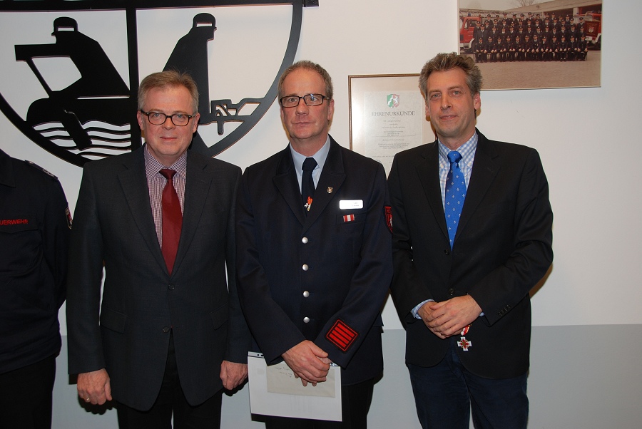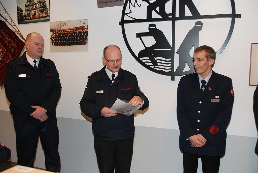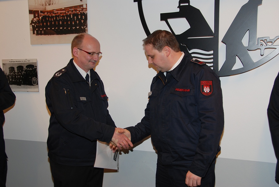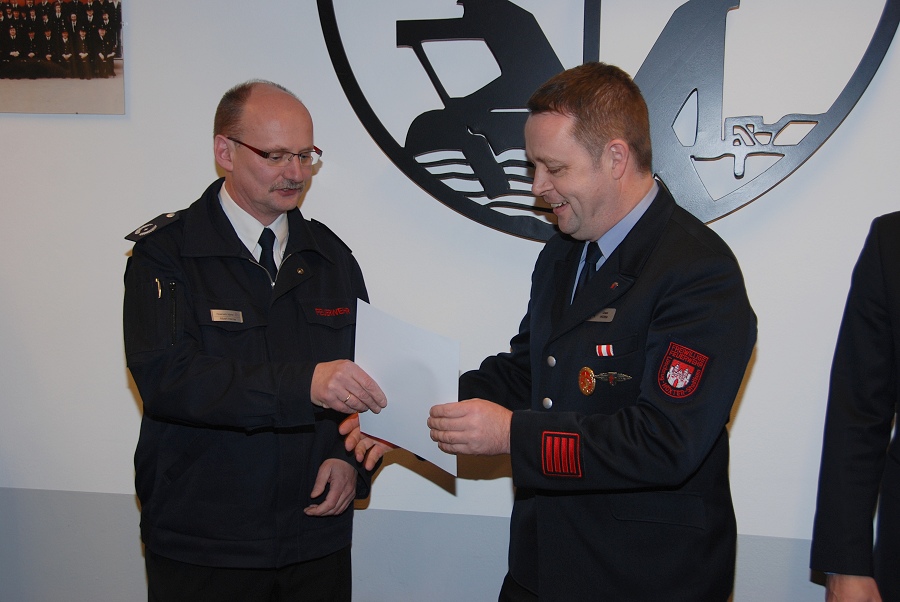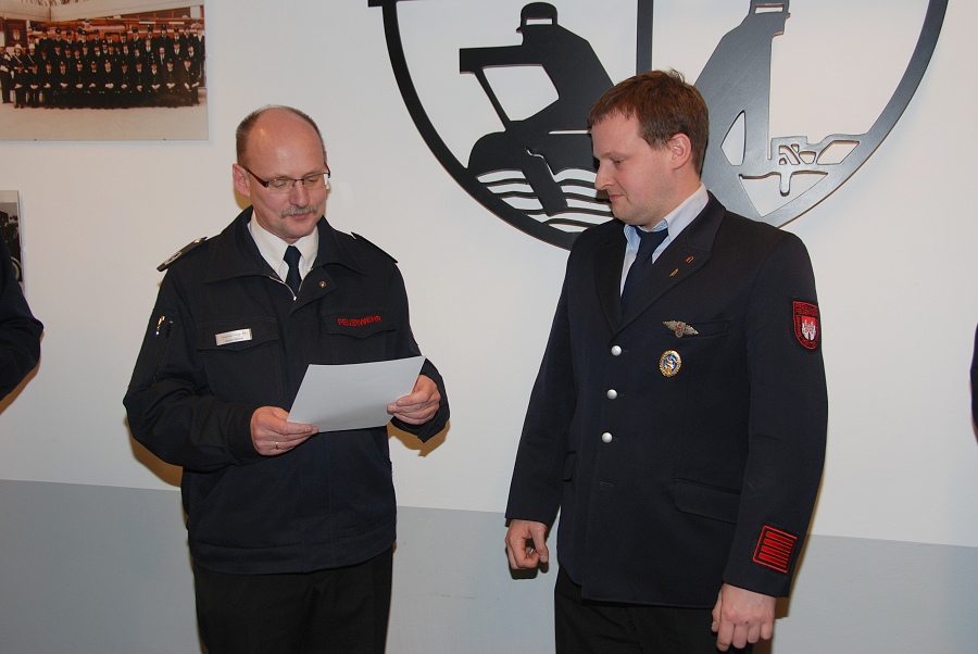 Weitere Ehrungen nahm der stellvertretende Wehrführer Albert Henne sowie der Löschzugführer Jürgen Schmits vor. Für 30 Jahre aktiven Dienst verlieh Löschzugführer Jürgen Schmits Urkunden an Brandinspektor Holger Dittrich, Hauptbrandmeister Olaf Dittrich sowie Hauptfeuerwehrmann Christoph Jaeger. Die Brandinspektoren Rainer Höppner und Christian Grimm wurden für jeweils 20 Jahre aktiven Dienst mit Urkunden ausgezeichnet. Die Ehrennadel des Deutschen Feuerwehrverbandes für 10 Jahre aktiven Dienst wurde Oberfeuerwehrmann Philipp Zimmermann und Unterbrandmeister Marcel Wagner verliehen. Eine Beförderung zum Brandinspektor erhielt der Kamerad Steven Noble. Zu Hauptbrandmeistern wurden Jürgen Schmits und Falk Tschirner vom stellvertretenden Leiter der Feuerwehr, Albert Henne, befördert. Zum Brandmeister konnte Uwe Heidrich und zum Unterbrandmeister konnte Marcel Wagner befördert werden. Eine Beförderung zum Oberfeuerwehrmann kam den Kameraden Tim Klingenhagen und André Kasten zu Teil. Das Leistungsabzeichen in Gold auf grünem Grund für 20 erfolgreiche Teilnahmen an den Leistungswettkämpfen erhielt Unterbrandmeister Uwe Hütte. Gold auf rotem Grund für 15 erfolgreiche Teilnahmen erhielt Unterbrandmeister Sascha Kamp und Silber ging an den Unterbrandmeister Marcel Wagner.