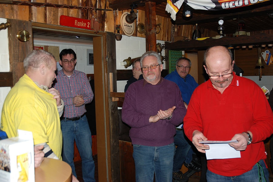 Höxter / 09.02.2013 (TKu) Seit Mitte der 80er Jahre ist das öffentliche Preisskatturnier des Löschzuges Höxter um den "Willi-Stridick-Gedächtnispokal" schon nicht mehr beim Löschzug Höxter wegzudenken. In diesem Jahr nahmen insgesamt 22 Teilnehmer am Turnier teil, worüber Klaus Henniges vom Organisationsteam sehr erfreut war. Die Anfänge des Skatturnieres gehen bis in die 70er Jahre zurück. Die Sieger dieses öffentlichen Preisskats werden erst seit 1991 schriftlich festgehalten. Seit 1995 kann der "Willi-Stridick-Gedächtnispokal" errungen werden. Dieser Wanderpokal wurde nach einem der Mitbegründer des Skatturniers benannt, der vor 15 Jahren verstorben ist. Sieger des diesjährigen Preisskats wurde Peter Nostiz mit 2259 Punkten. Den Pokal überreichte ihm Klaus Henniges bei der Siegerehrung im Feuerwehrkeller.