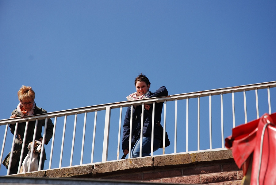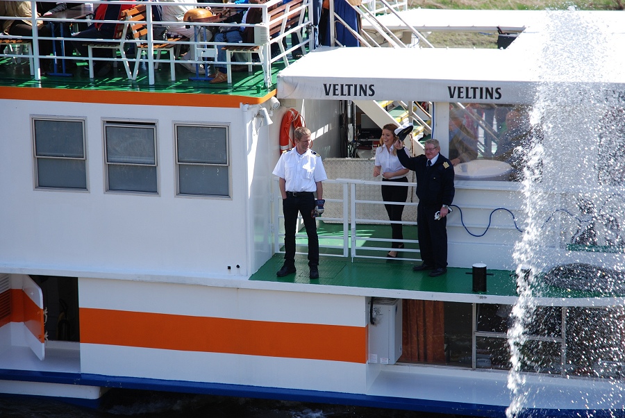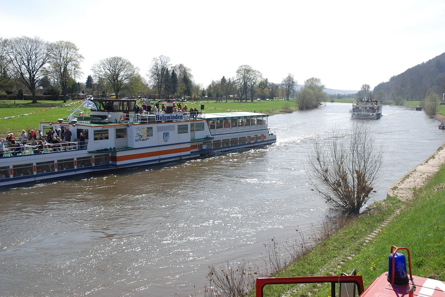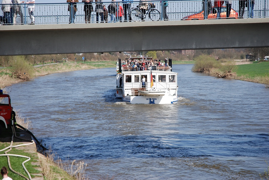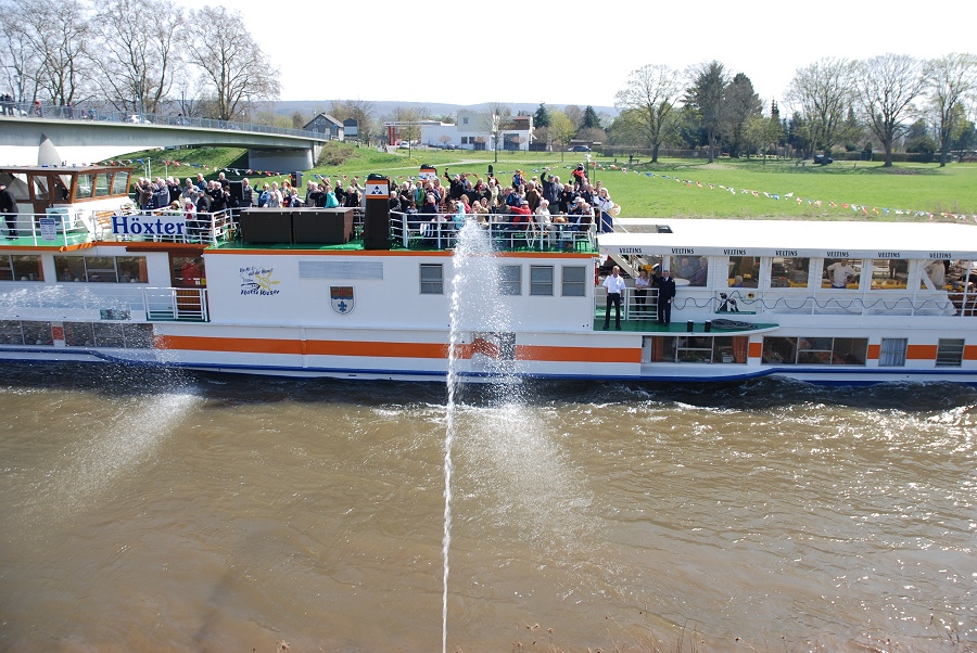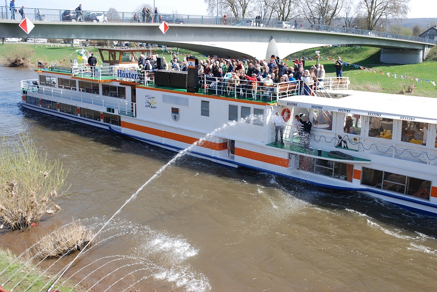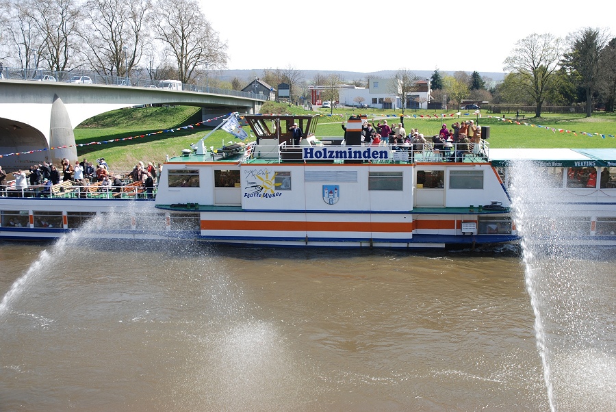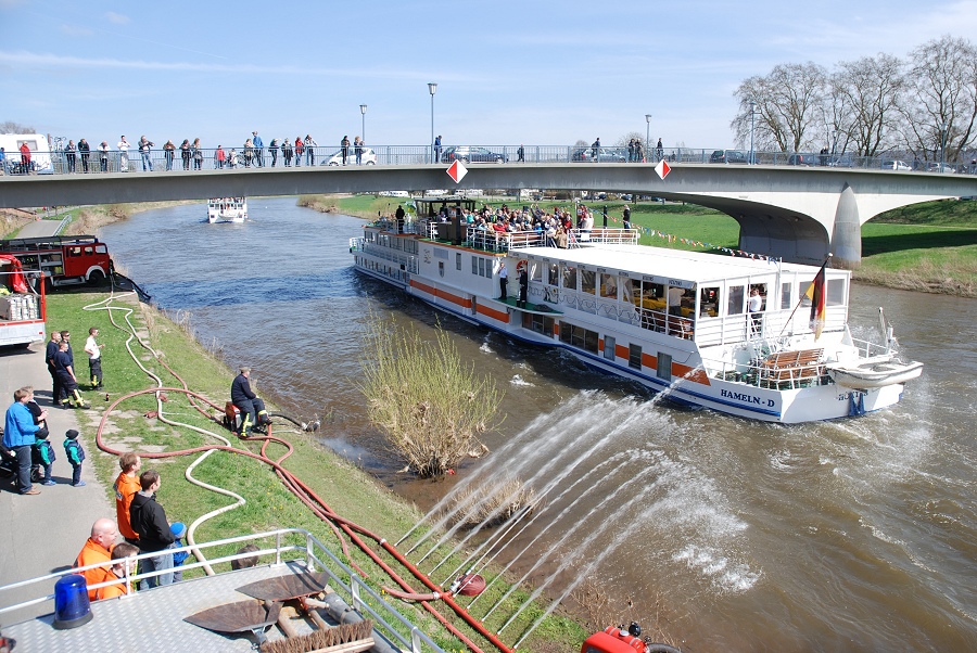 Höxter / 20.04.2013 (TKu) Mit Wasser-Fontänen hat der Löschzug Höxter auch in diesem Jahr wieder die "Flotte Weser" zu ihrer Eröffnungsfahrt auf der Weser in Höxter begrüßt. Auf dem Weg von Bad Karlshafen bis nach Hameln kamen die Passagierschiffe der Schiffsflotte auf ihrer 90km langen Fahrt auch durch Höxter, wo sie gegen 13:30 Uhr am Schiffsanleger Halt machten. Dabei begrüßten die Feuerwehrleute die jubelnden und winkenden Passagiere mit Blaulicht und Martinshorn und den traditionellen Wasserspielen, erzeugt durch eine Wasserorgel, während sie nach dem Ablegen weiter in Richtung Corvey fuhren.