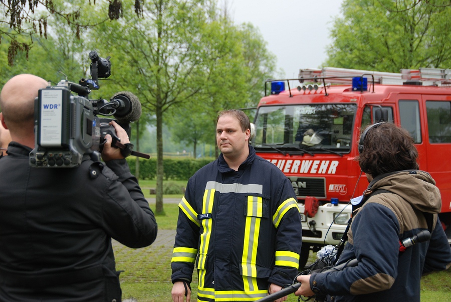 Höxter / 27.05.2013 (TKu) Im WDR-Fernsehen wurde von dem Wohnmobil-Brand am Freizeitsee Höxter-Godelheim ein kurzer Fernsehbericht gesendet. Der Bericht ist in Zusammenarbeit mit der Polizei und der Feuerwehr u.a. auch am Ort des Geschehens gedreht worden und war in den Kurznachrichten der WDR-Lokalzeit um 19:30 Uhr zu sehen. Zu dem Einsatzablauf von Seiten der Feuerwehr gab der stellvertretende Löschzugführer Steven Noble dem Fernsehteam ein kleines Interview. Bei dem Wohnmobil-Brand am Freizeitsee Höxter-Godelheim war zum Glück keine Person zu Schaden gekommen, das Wohnmobil brannte jedoch völlig aus. Mehr Infos zum Einsatz finden Sie auf unserer Einsatzseite.