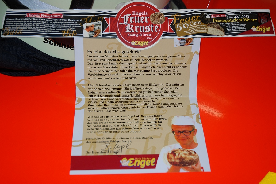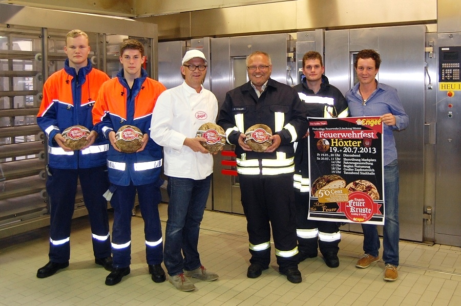 Die "Feuer Kruste" ist in 15 Filialen der Bäckerei Engel in Höxter, Lüchtringen, Beverungen, Holzminden und Vörden erhältlich. Den Startschuss für das neue Brot mit extra Feuerwehr-Banderole des Löschzuges Höxter gaben jetzt Firmeninhaber Bernd Engel mit seinem Mitarbeiter Lasse Lämmerhirt von der Öffentlichkeitsarbeit der Firma Engel gemeinsam mit Peter Schnabel und André Kasten vom Löschzug Höxter sowie Stefan Susewind und Philipp Müller von der Jugendfeuerwehr Höxter. Durch die unverwechselbare Banderole hofft die Feuerwehr der Kernstadt Höxter auf eine große öffentliche Bekanntmachung des Feuerwehrfestes am 19. und 20. Juli.