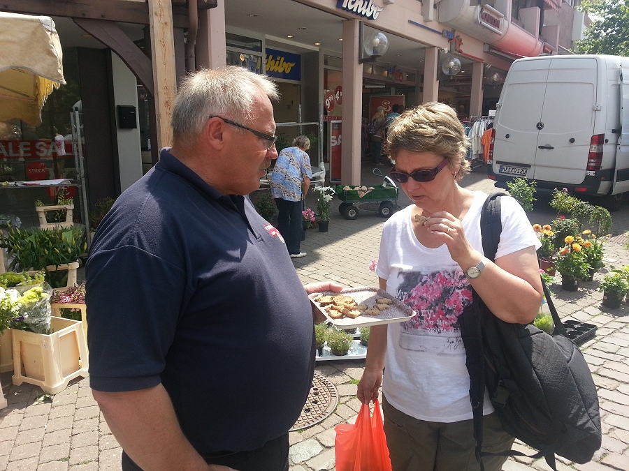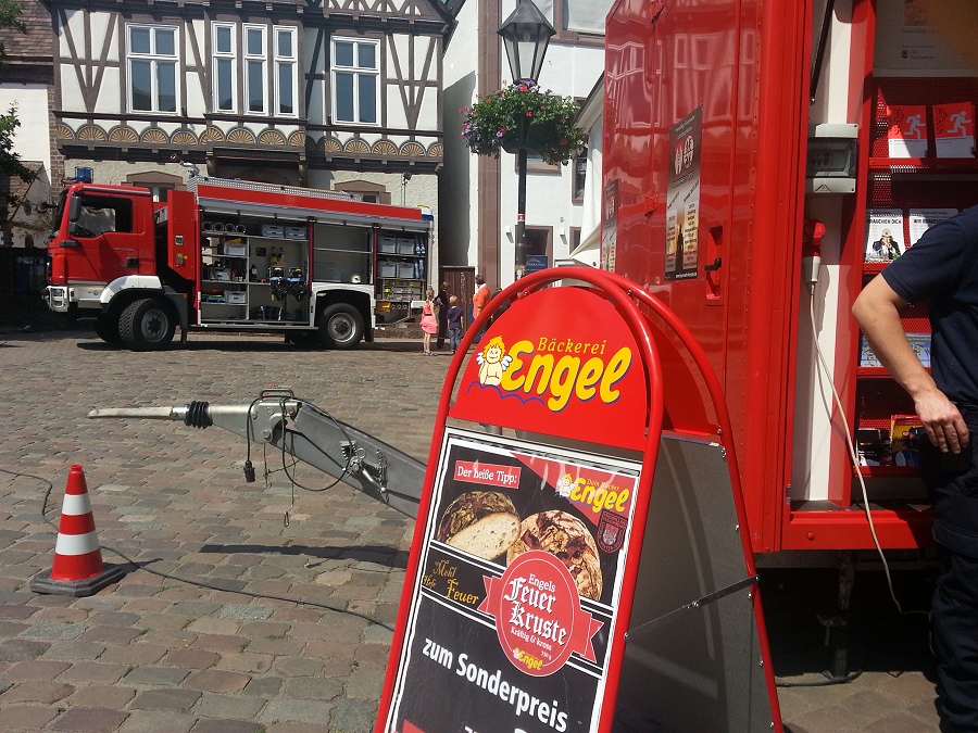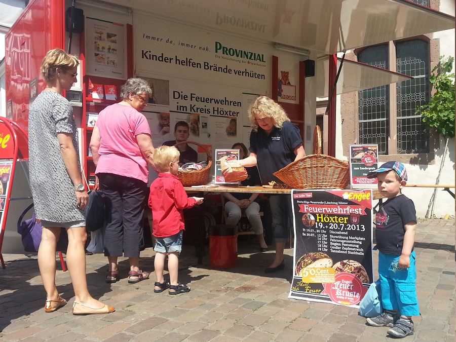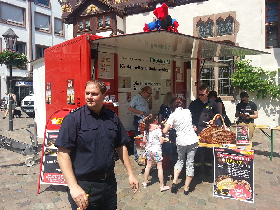 Höxter / 06.07.2013 (TKu) Mit dem Infomobil und dem neuen TLF3000 zeigte sich der Löschzug Höxter nun auf dem Markt in Höxter präsent, um das Feuerwehrfest des Löschzuges, das am 19. und 20. Juli gefeiert wird, bekannter zu machen. Neben Spiel und Spaß für Kinder mit der Waldbrand-Spritze setzten die Feuerwehrleute auch auf Brandschutzerziehung mit dem Rauchzelt, dem Notruf-Telefon und genügend Infomaterial. Zugunsten der Jugendfeuerwehr wurde das neue Feuerwehrbrot, die "Feuer-Kruste" verkauft. Probierhäppchen verteilten die Kameraden an die Bevölkerung. Das Brot wurde gut angenommen, berichtet der stellvertretende Zugführer Steven Noble. 50 Cent von jeder verkauften Feuer-Kruste geht an die Jugendfeuerwehr Höxter für die Jugendkasse.