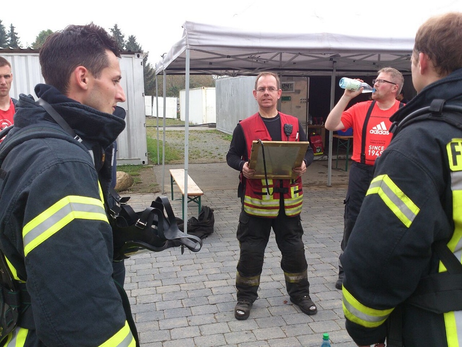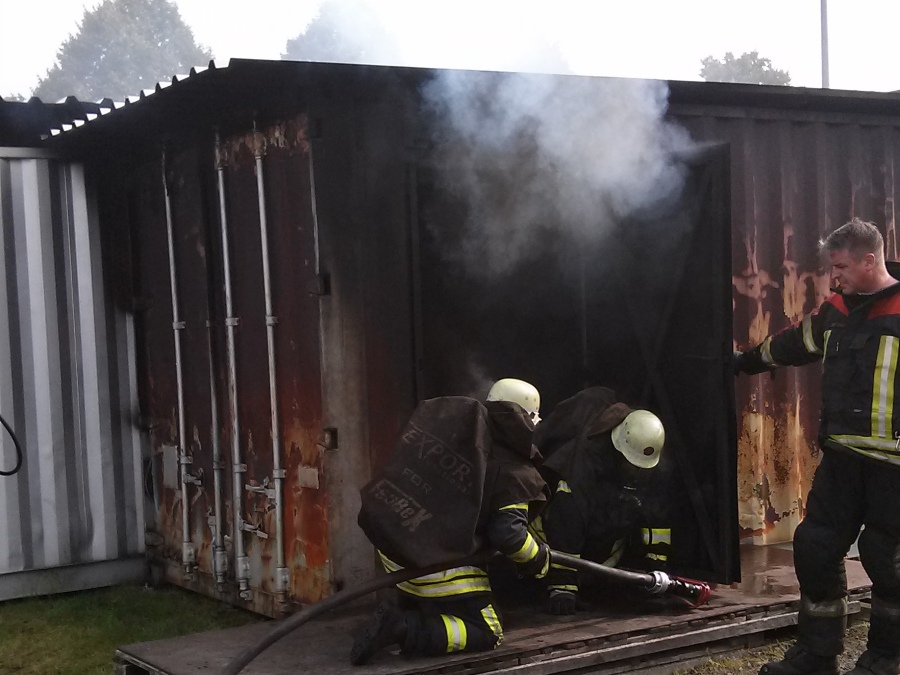 Begonnen haben die vier ausgebildeten Atemschutzgeräteträger André Kasten, Philipp Zimmermann, Marcel Wagner und Stefan Büker aber mit einem Strahlrohrführertraining. Anschließend ging es in die Feststoffanlage, in der die Kameraden eine Atemschutzstrecke auf zwei Ebenen durchlaufen haben, unter Reifen her und durch schmale Gänge und Türen hindurch. Danach musste eine Menschenrettung bei null Sicht durchgeführt werden. Bei der anschließenden Heißausbildung haben die Ausbilder die unterschiedlichen Wirkungsweisen der Strahlrohreinstellungen demonstriert. Türöffnung, Temperaturcheck und Rauchgase abkühlen wurden in der Heißausbildung vermittelt, ebenso wie das Verhalten bei einer Durchzündung. Die Deckentemperatur im Brandraum lagen zwischen 800 undbis 900° Celsius.
