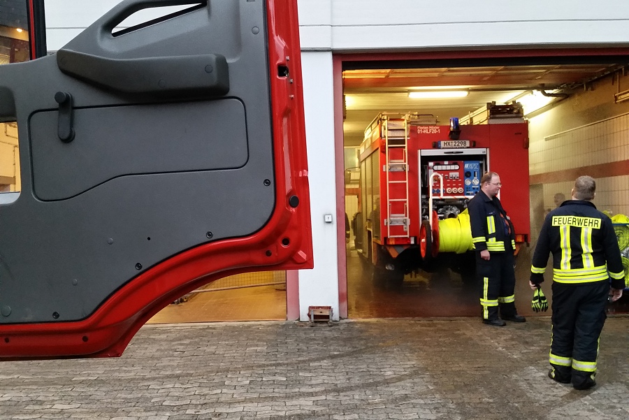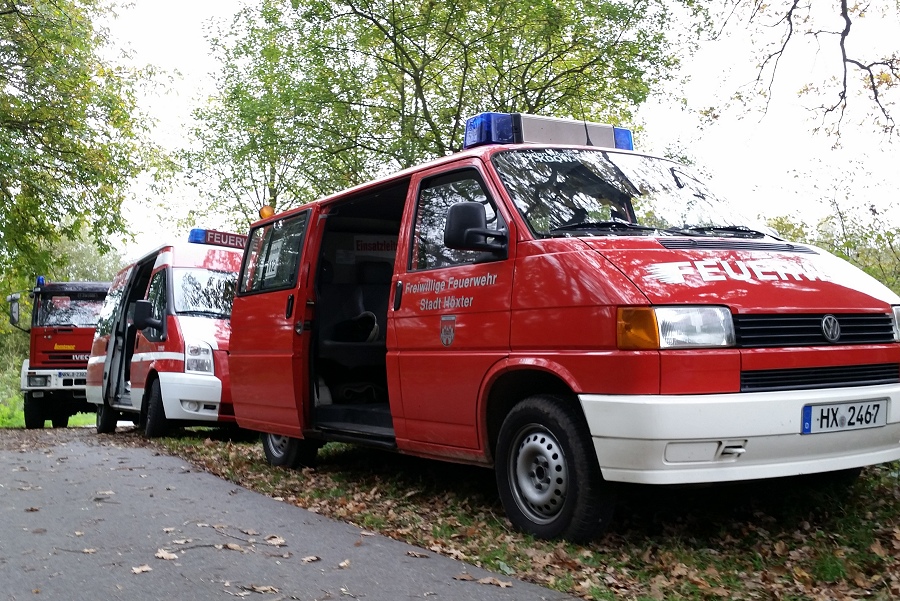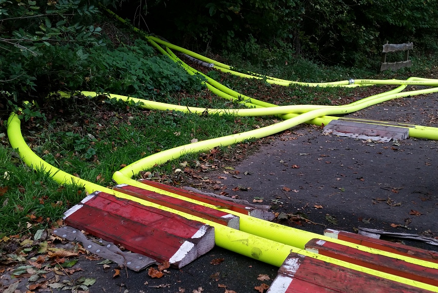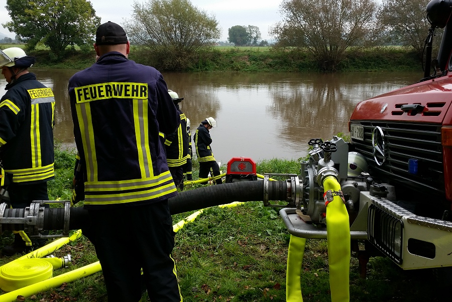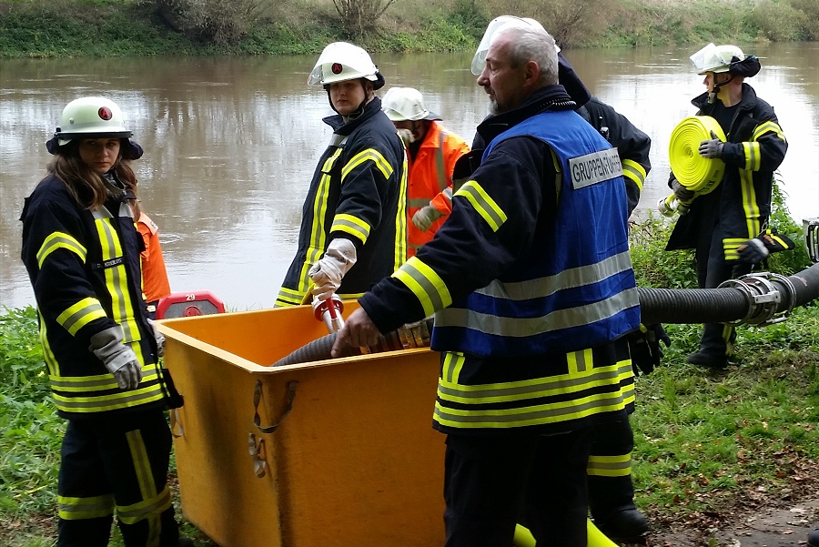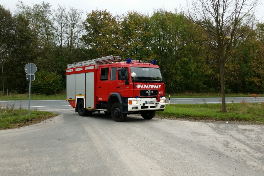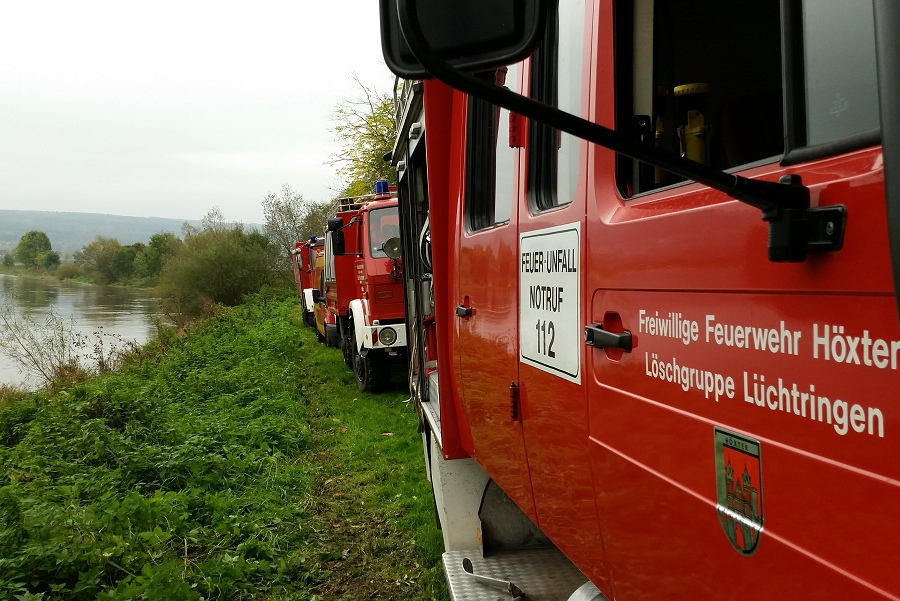 Höxter / 25.10.2014 (TKu) Gemeinsam mit der Löschwasserversorgungskomponente Höxter hat der Löschzug Höxter eine Waldbrandübung in der Gemarkung Nachtigall zwischen Albaxen und Höxter gefahren. 300 Meter Entfernung und 65 Höhenmeter galt es von der Wasserentnahmestelle bis zur Einsatzstelle mit B-Schäuchen zu überwinden. Vier B-Leitungen legten die Feuerwehrleute von der Weser aus bis zur Einsatzstelle im Wald unter der Bundesstraße 64 hindurch.