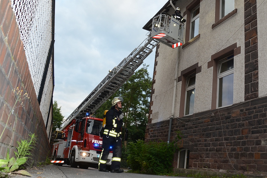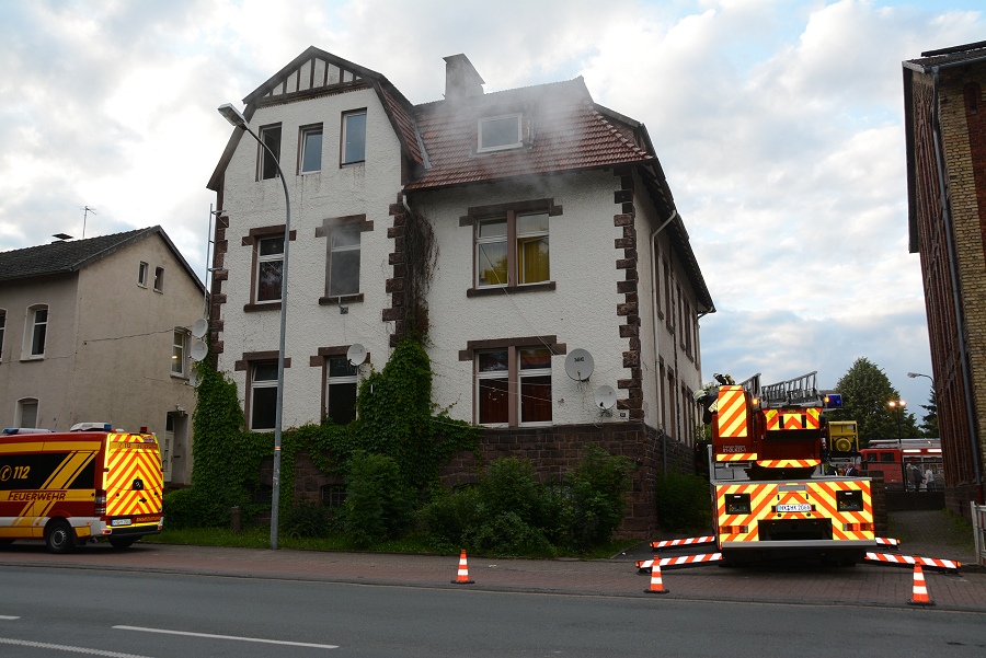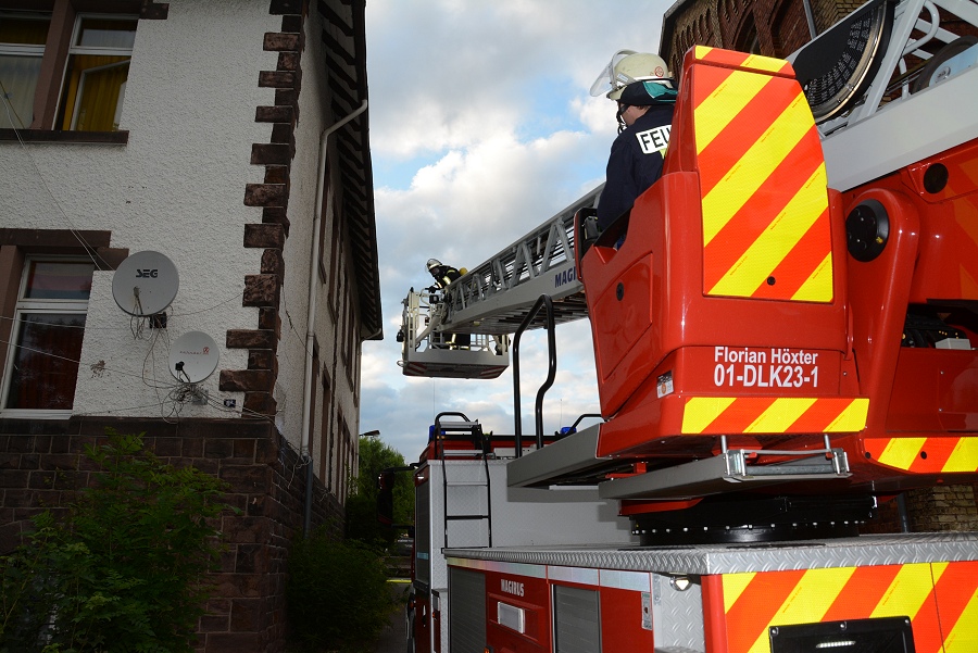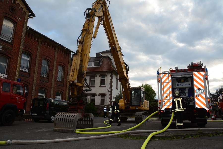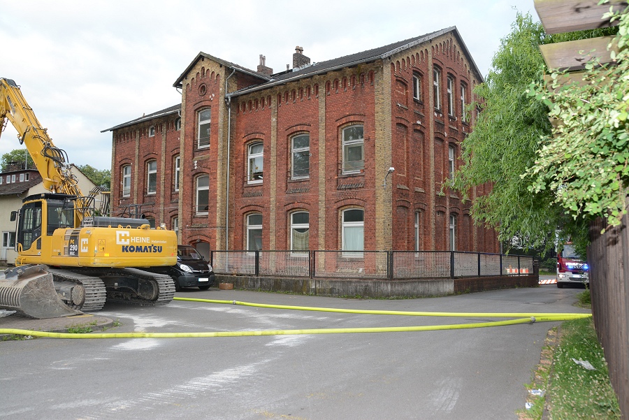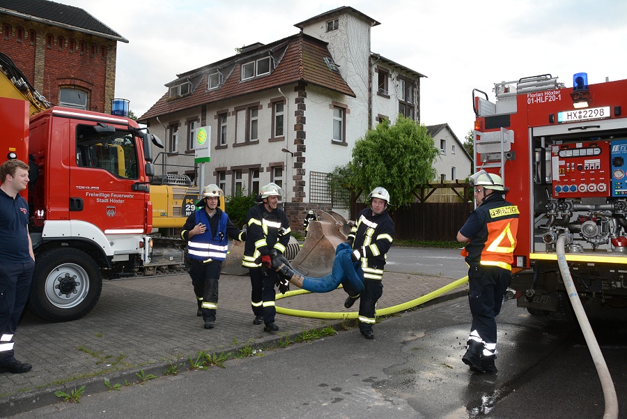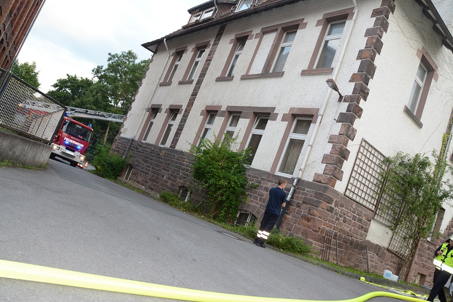 Höxter / 08.07.2016 (TKu). Einsatz für den Löschzug Höxter: Brand in der (ehemaligen) Asylunterkunft an der Lütmarser Straße. Mehrere Personen befinden sich in unmittelbarer Lebensgefahr! Zum Glück handelte es sich bei dieser Alarmmeldung nur um eine Einsatzübung des Löschzuges Höxter im Rahmen des geplanten Übungsdienstes an einem Objekt mit historischem Seltenheitswert für Höxter. Das Übungsobjekt wurde in dieser Form nun ein letztes Mal beübt, denn die gesamte Häuserzeile Nummer 4 bis 14 an der Lütmarser Straße soll in Kürze abgerissen werden. Der Abrissbagger steht bereits hinter den Gebäuden in Stellung! Bei den Übungsgebäuden handelt es sich um ehemalige Preußenkasernen aus den Jahren 1880 (Hausnummer 6 und 6a). Das Übungshaus selbst (Nummer 6a) hatte damals als Lazarett gedient.