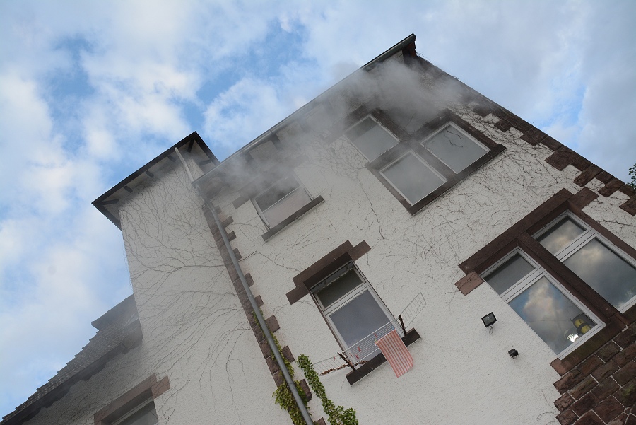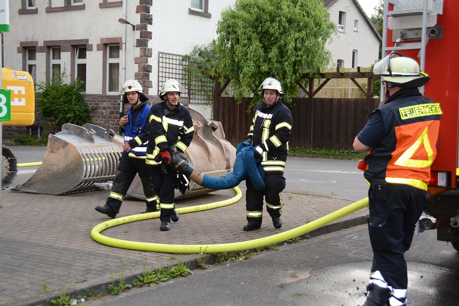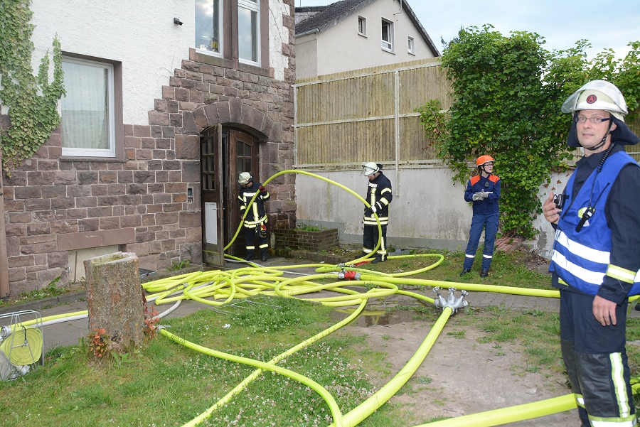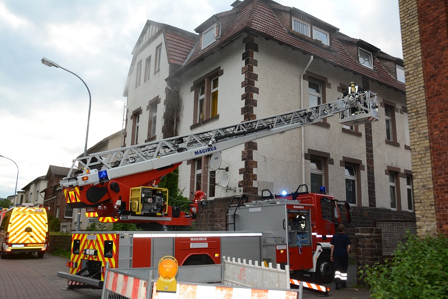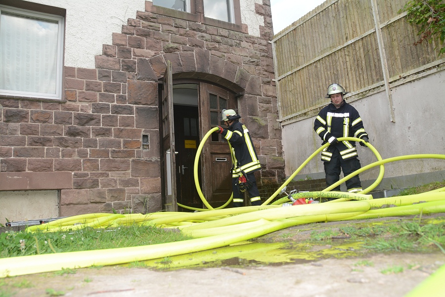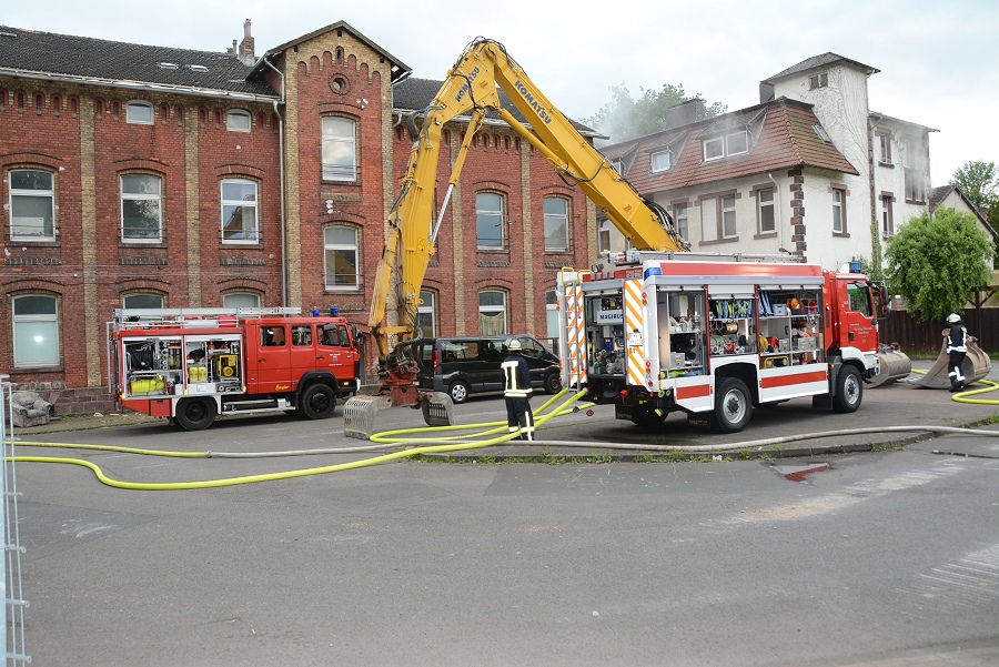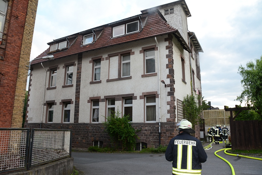 Höxter / 08.07.2016 (TKu). Einsatz für den Löschzug Höxter: Brand in der (ehemaligen) Asylunterkunft an der Lütmarser Straße. Mehrere Personen befinden sich in unmittelbarer Lebensgefahr! Zum Glück handelte es sich bei dieser Alarmmeldung nur um eine Einsatzübung des Löschzuges Höxter im Rahmen des geplanten Übungsdienstes an einem Objekt mit historischem Seltenheitswert für Höxter. Das Übungsobjekt wurde in dieser Form nun ein letztes Mal beübt, denn die gesamte Häuserzeile Nummer 4 bis 14 an der Lütmarser Straße soll in Kürze abgerissen werden. Der Abrissbagger steht bereits hinter den Gebäuden in Stellung! Bei den Übungsgebäuden handelt es sich um ehemalige Preußenkasernen aus den Jahren 1880 (Hausnummer 6 und 6a). Das Übungshaus selbst (Nummer 6a) hatte damals als Lazarett gedient.