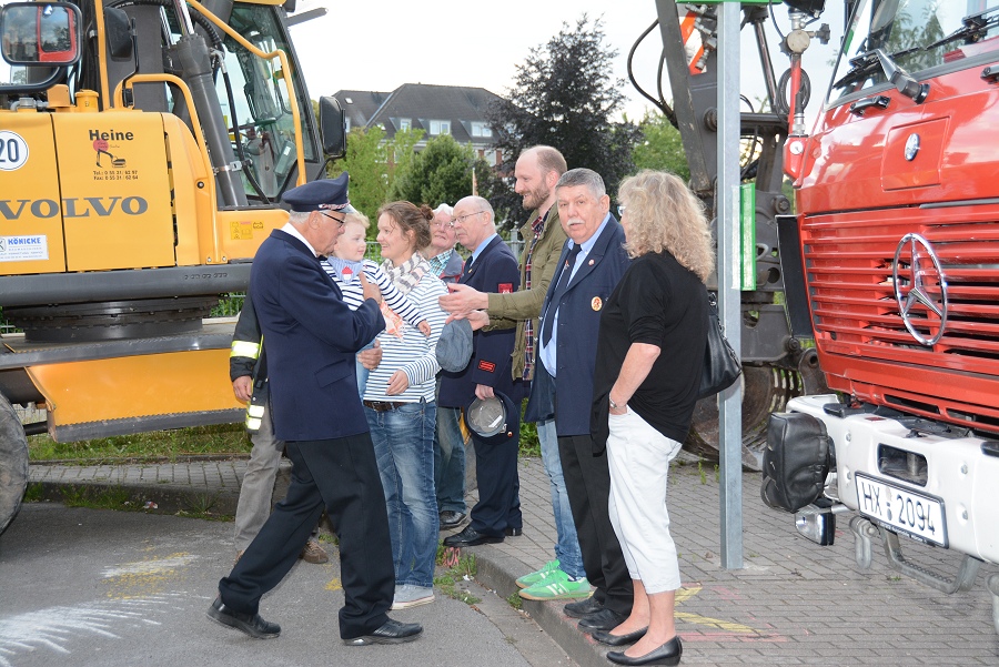 Auf dem Parkplatz des Berliner Platzes befanden sich ebenfalls zwei baugleiche Kasernen, die Anfang des vergangenen Jahrhunderts abgerissen und durch einen neuen Kasernenblock ersetzt worden sind, wie er noch heute in der Stummrigen Straße Nummer 56 vorhanden ist und unter Denkmalschutz steht. 1981 wurden auch diese Bauten dem Erdboden gleich gemacht. Das Foto mit den Feuerwehrleuten aus dem Jahre 1903 entstand kurz vor dem Abriss der alten Kasernen. 113 jahre später gibt es noch eine letzte dieser vier baugleichen Kasernen von 1880. Sie werden in Kürze abgerissen. Ebenso wie vor 113 Jahren haben sich die Höxteraner Feuerwehrleute kurz vor dem Kasernenabriss noch einmal in ähnlicher Pose wie 1903 vor dem Gebäude ablichten lassen nach ihrer Übung. Das Geländer ist übrigens noch original so erhalten, wie es 1903 der Fall war. Ein historisches Foto! Aber nun kurz zur Übung: Das Übungsszenario war dramatisch und verlangte den Kameraden wie immer alles ab. Es sind alle Personen aus dem Gebäude in Sicherheit gebracht worden und auch der angenommene Küchenbrand konnte schnell gelöscht werden.