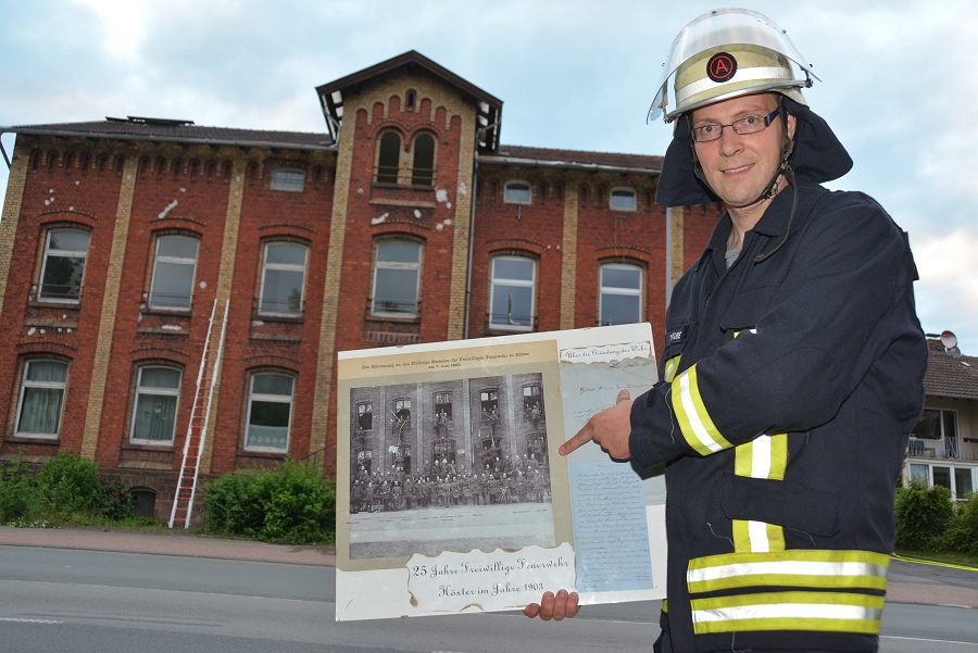 Das Hauptgebäude (Hausnummer 6) direkt nebenan wurde nicht geübt. Dort wurde jedoch nach der Übung ein Foto nachgestellt, auf dem die Freiwillige Feuerwehr Höxter mit ihrer Musikkapelle schon im Jahre 1903 abgelichtet wurde, zu dessen 25-jährigen Jubiläum. Die ehemaligen Kasernen befindet sich heute von außen noch im Originalzustand. Nach dem Einmarsch preußischer Truppen im Jahr 1801 benötigten die Preußen Unterkünfte, die sie durch den Bau von Kasernen ab dem Jahr 1860 vor den Stadttoren außerhalb der Altstadt realisiert haben. Vor 150 Jahren gab es außerhalb der Stadtmauer von Höxter kaum Bebauung. Die Lütmarser Straße Nummer 6 (wo das aktuelle Gruppenfoto entstand) waren die Mannschaftsunterkünfte. Das Offiziershaus (Nummer 10) mit eigenem Pferdestall ist reicher gestaltet worden, was den Klassenunterschied zwischen den adeligen Offizieren und den einfachen Soldaten ausgemacht hat.